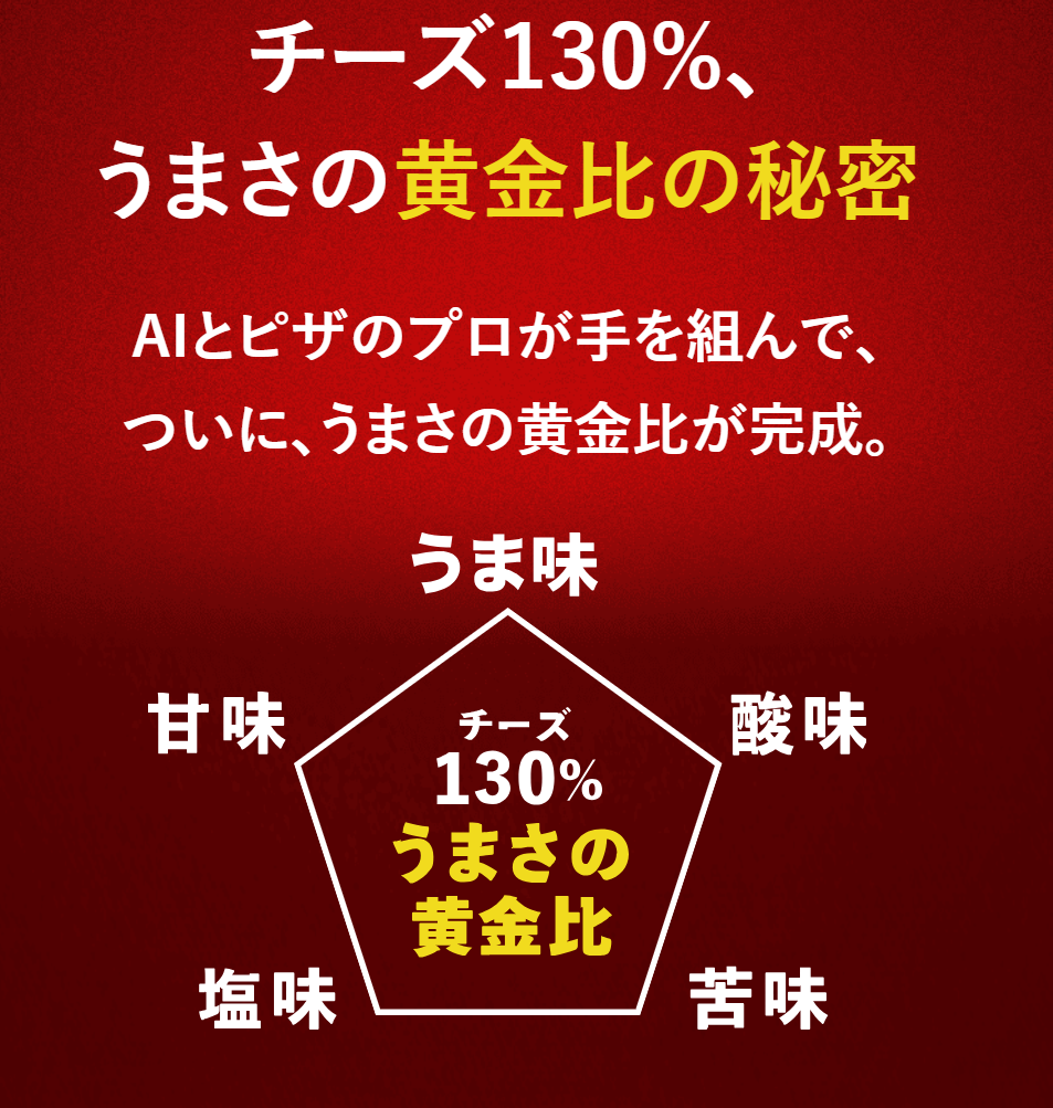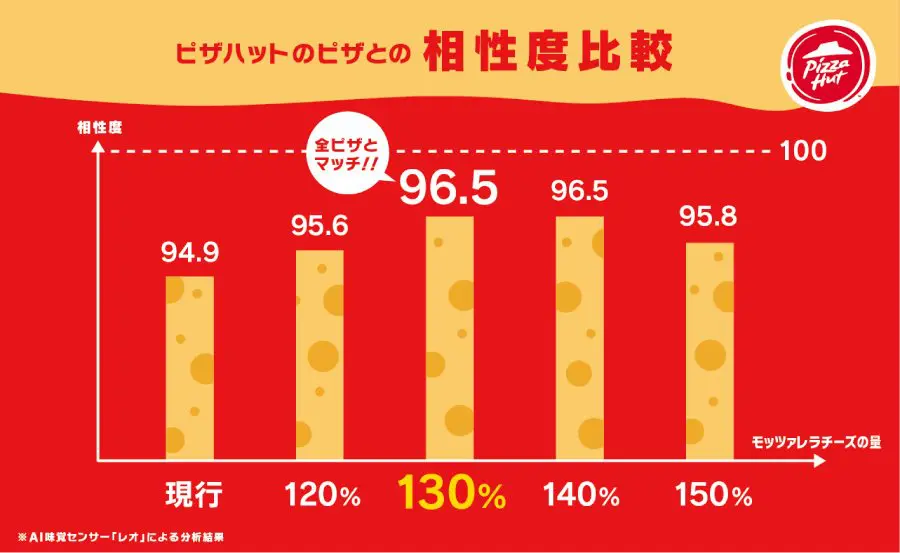 透過 AI 的分析,為了讓披薩變得更美味,推出其中的關鍵在於調整莫札瑞拉起司的量。經過多次分析後,結果顯示,現有的披薩麵皮、醬料和配料與莫札瑞拉起司的搭配中,130 %和 140 %的起司量效果最好,而 150 %時效果反而下降。
