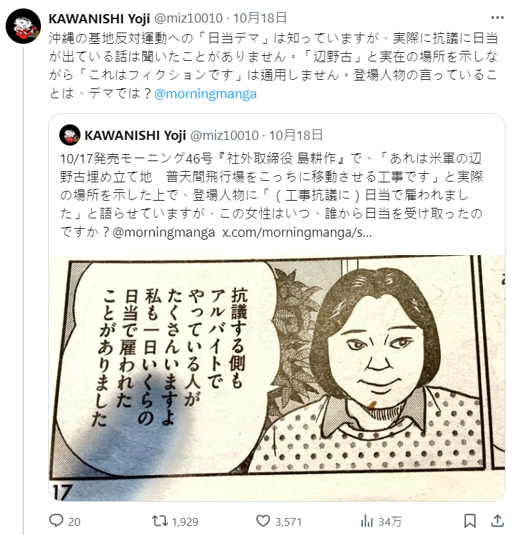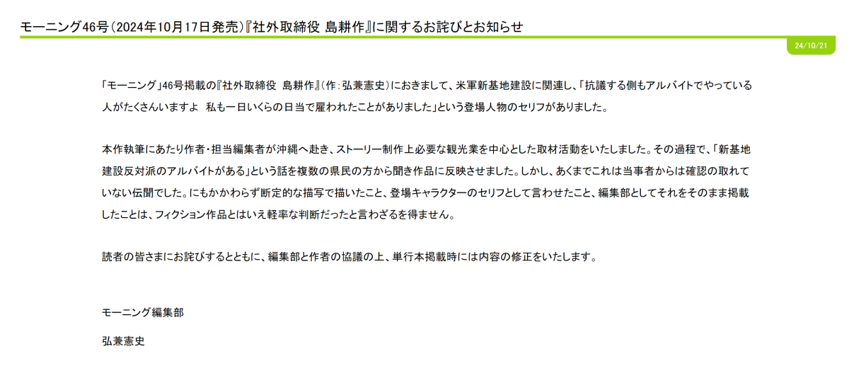 到了今日 ( 10/21 ),《Morning》官方刊出道歉公告,表示對白提到「反對美軍新基地建設的人當中,有許多是打工的。我自己也曾以日薪多少的方式被雇用過。」關於這段對白,作者與負責編輯曾前往沖繩進行調查,以觀光業為主題進行故事構思。在此過程中,從多位沖繩縣民處聽聞了「反對新基地建設的一方有走路工」的說法,並將其反映於作品中。