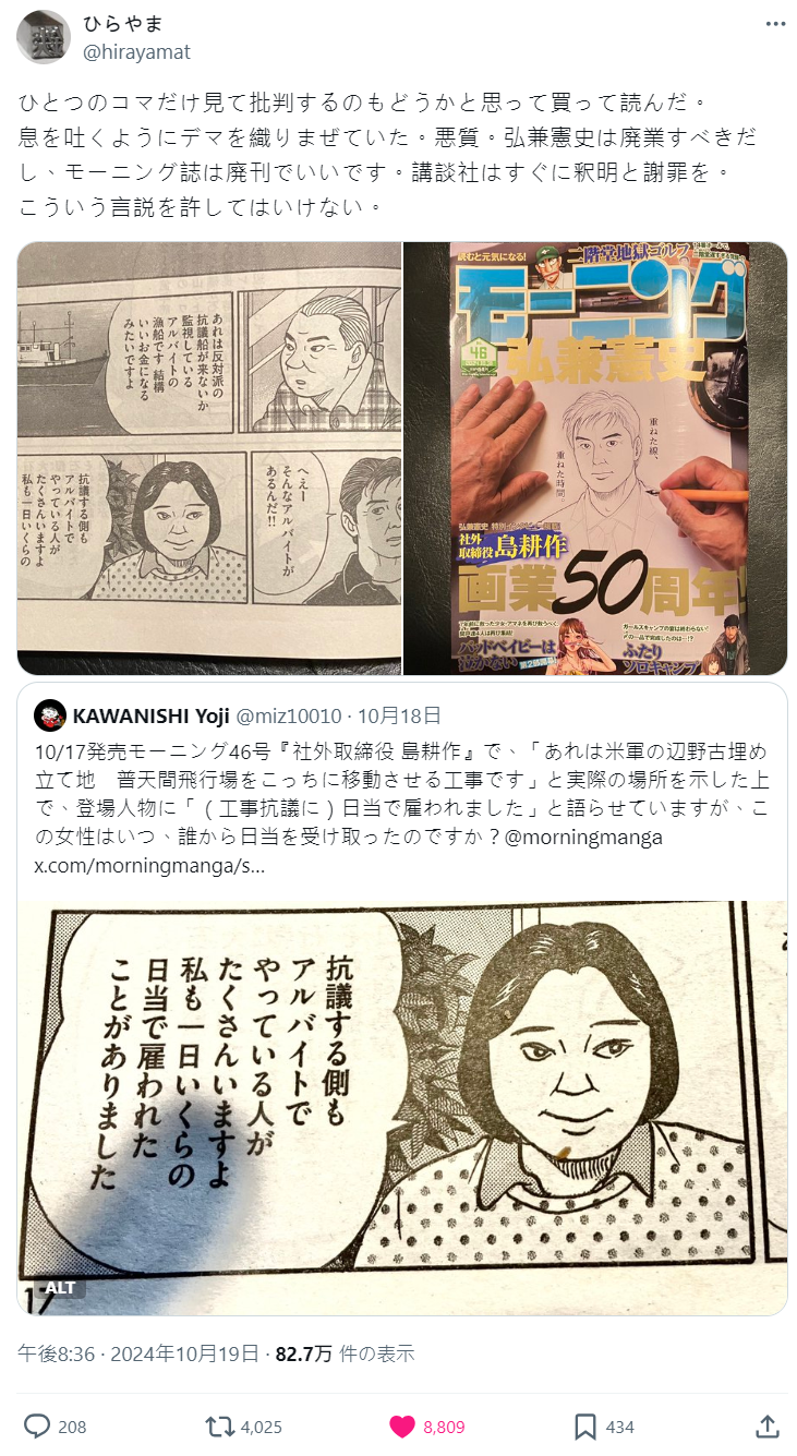 對於這個抗議多年的社會運動遭到漫畫莫名的用謠言當作事實創作,也難怪聲援抗議的網友非常憤怒。認為這樣把謠言融入故事真的很惡劣。弘兼憲史應該退出漫畫界,而《Morning》這本雜誌也乾脆廢刊算了,講談社必須立刻出來解釋並道歉,我們絕不能縱容這樣的言論。