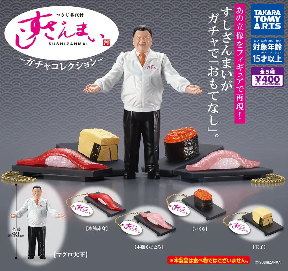 但現在轉蛋的內容真的包羅萬象,近日日本釋出一款由連鎖店鋪築地喜代村壽司三味 ( つきじ喜代村 すしざんまい ) 的轉蛋,轉蛋中除了壽司外,居然還有創立的社長本人「鮪魚大王」( マグロ大王 ) 的模型,引起不少日本網民熱議,甚至很想擁有。