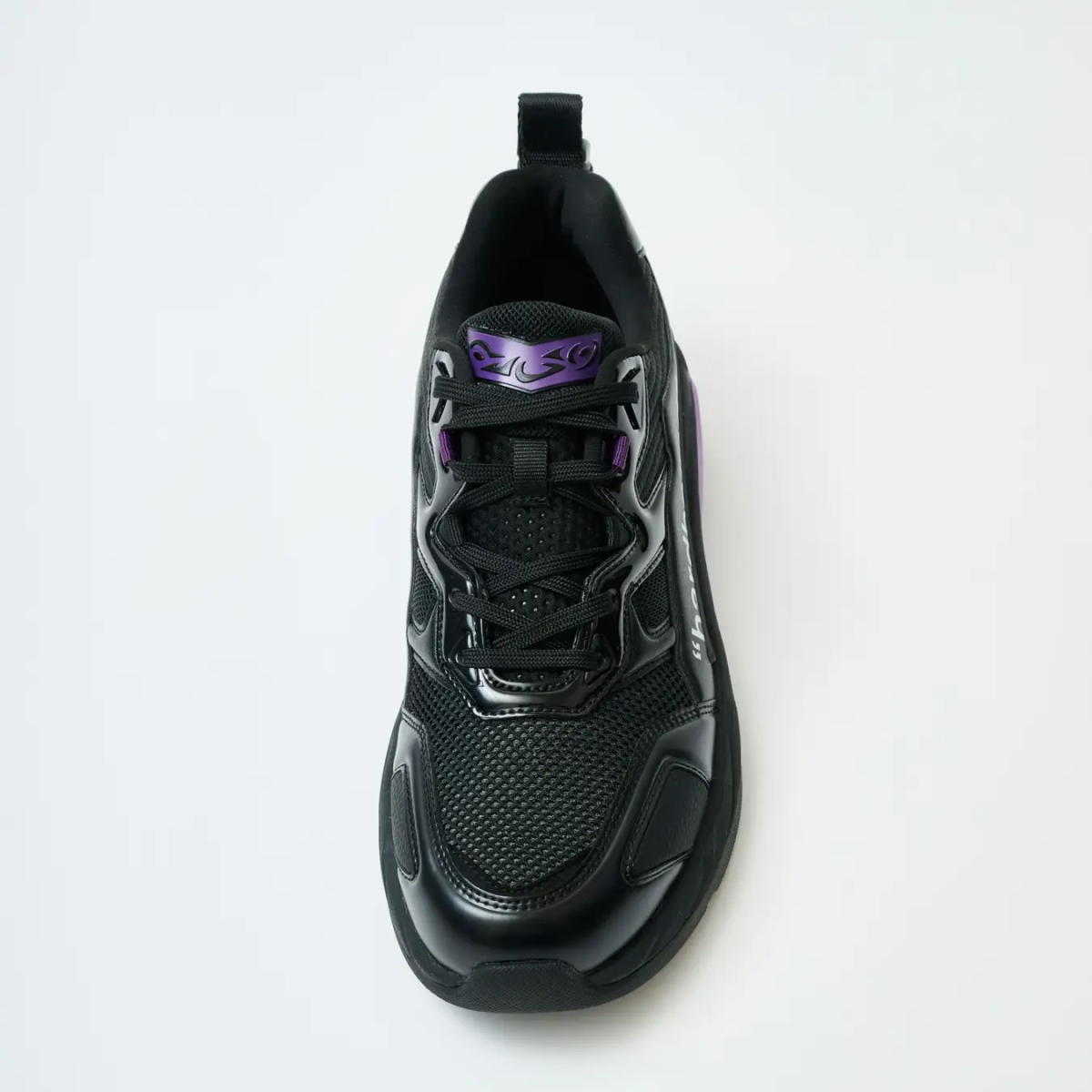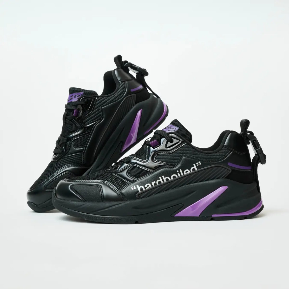 運用了多種不同材質的黑色來表現,讓鞋子具備設計感且更具特色。鞋舌部分採用了「假面騎士JOKER」胸前的圖案設計,且靈感來自變身者「左翔太郎」。特別在左腳鞋面印上了「hardboiled」字樣的一半,展現出假面騎士JOKER的風格,