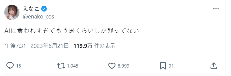 早在去年的 6 月,えなこ就表示 : 「被AI吃得差不多只剩下骨頭了。」,可以發現像他這樣高人氣的 Coser,卻被許多無斷使用的生成 AI 所困擾,自己得意的作品被這樣使用,感到非常灰心。
