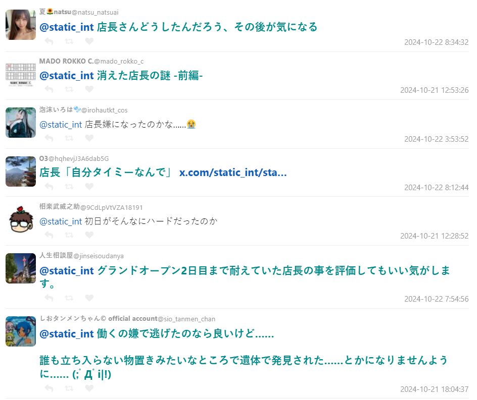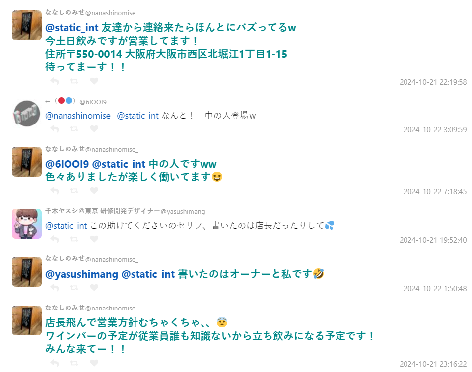 當這件事情引起熱議後,結果現在還在店裡工作的員工在 X 上出現了,表示其實店家還在營業,店長突然跑了,現在營運方針超亂的…,原本是要開紅酒酒吧,但員工完全沒有人懂酒,所以決定改成「立ち飲み屋」的形式營業,希望大家快來捧場啊。