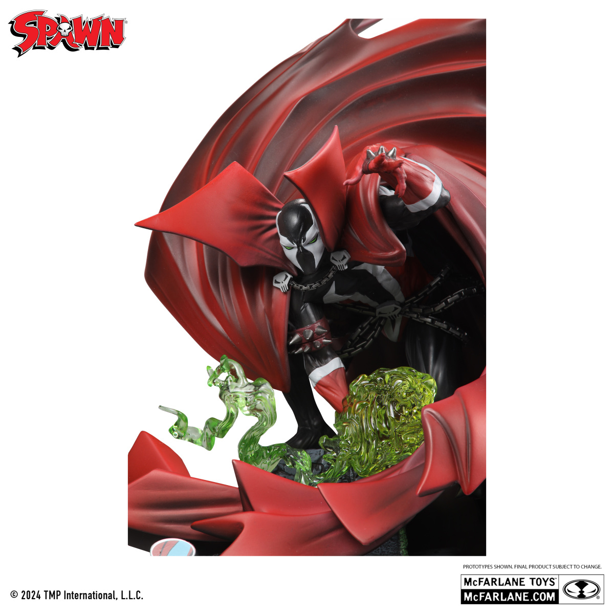 本次依照《閃靈悍將》漫畫第一期(Spawn #1)為題打造的樹脂雕像高約 24 公分,將 Todd McFarlane 所繪製的經典閃靈悍將漫畫封面生動再現,從高高舉起的左手、黑白主調的貼身戰衣、骷髏標誌與鎖鏈,到動態表現相當精彩的紅色披風都考究還原,而當時在封面中十分搶眼、煙霧狀的綠色能量也在這座雕像中以漂亮的透明件呈現出來,加上擁有 SPAWN LOGO、當初漫畫出版時位於封面左上角標籤的名牌,整體擁有絕佳展示性。