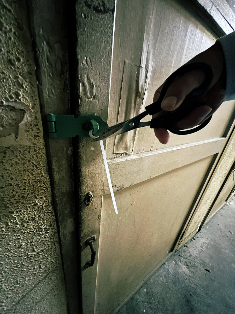 看看這嚇人的場景,不僅房間外走廊燈光昏暗,甚至入住的房間門還是用束線帶固定門鎖,房內看起來也異常老舊,不禁讓人感到毛骨悚然。