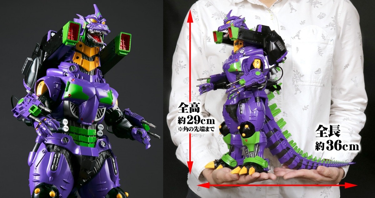 「東寶大怪獸 3式機龍(2002)重武裝型 EVA初號機配色」,與將發售的「3型機龍(2002)重型武裝型」採用相同的原型,尺寸全高約 29 公分、全長更達 36 公分,細膩刻畫出全身帥氣的機械細節,並裝備有複雜的 0 式磁軌砲、背包組件的大型火箭彈等重武裝!在機身注入了EVA初號機標誌性的紫綠配色,並以紅黃色點綴細節,打造出初號機形象的搶眼色澤!