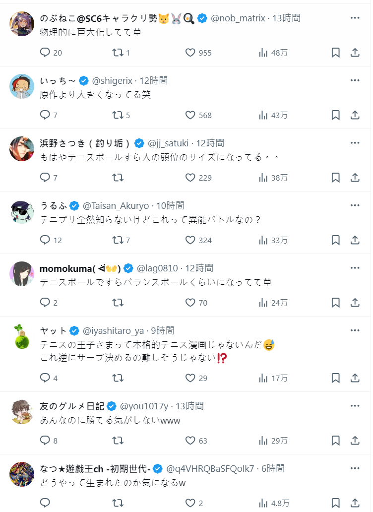 不少網友表示,動畫看起來比漫畫原作還大隻,甚至連網球都變大了,這到底要怎麼打啦,網球王子果然是個異能對戰作品呢 ( ? )