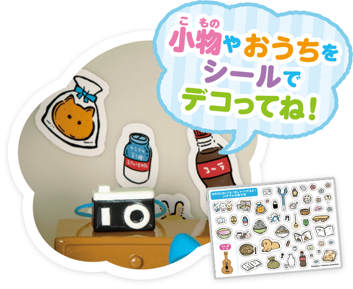 附有豐富的配件,包含有小八辛苦存錢買到的相機、超可愛睡衣,可以幫小八穿戴在身上互動,另外還有可以鑽進去躺躺的小被窩、唱片尾曲時用的吉他、小櫃子、花瓶與吃消夜和學習時使用的紙箱書桌等道具,生動賞玩劇中的情境家家酒~另外,還有多種道具小貼紙,可以貼在牆壁上當作裝飾!快來布置小八貓寶寶的家吧~