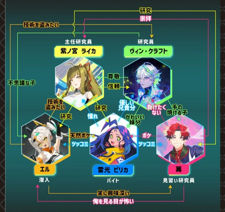 而五位角色也都有不同的眼睛,且能發的電也都不同,企劃還幫他們製作了人物關係圖,簡直是太用心了。