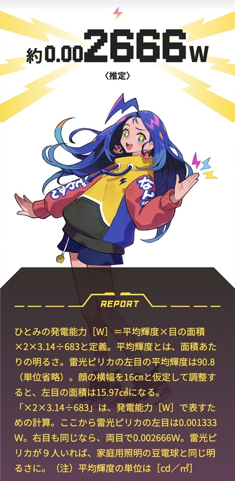 接著,就來跟大家簡單說明,這個企劃是如何驗證眼睛的「電」的。以雷光 ピリカ為例,她的雙眼可發出0.002666瓦的電力,而頁面底下也有說明,眼睛的發電力算式為「眼睛平均亮度✕眼睛的面積✕2✕3.14÷683」,且還給你了角色的眼睛平均亮度和大概的面積,如果有興趣的可以自行驗算。