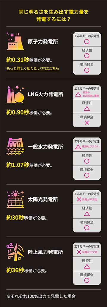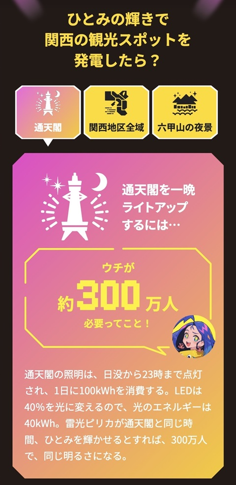 再來就是驗證若把眼睛發出的電力用在日常生活會需要多少的電...或者說眼睛,一樣是以雷光 ピリカ為例,若雷光 ピリカ有9人的話那就可以點亮一顆家用小燈泡,若有300萬個雷光 ピリカ則能將大阪通天閣點亮一晚之類的。
