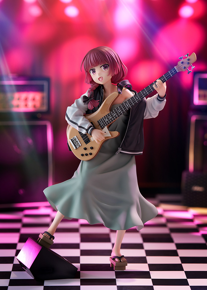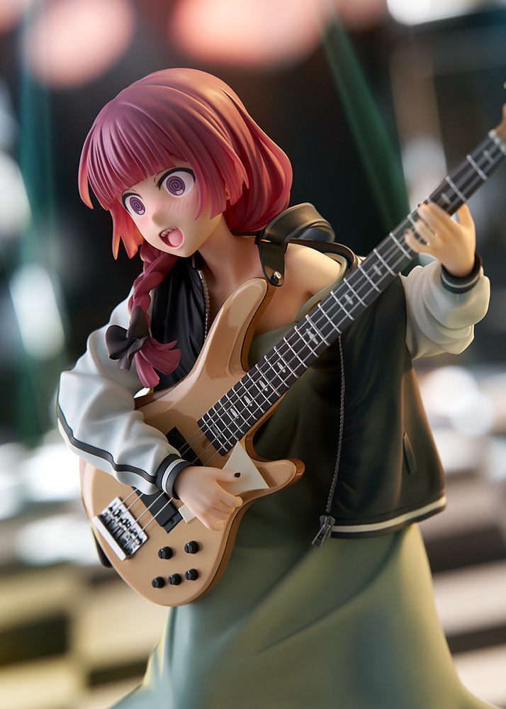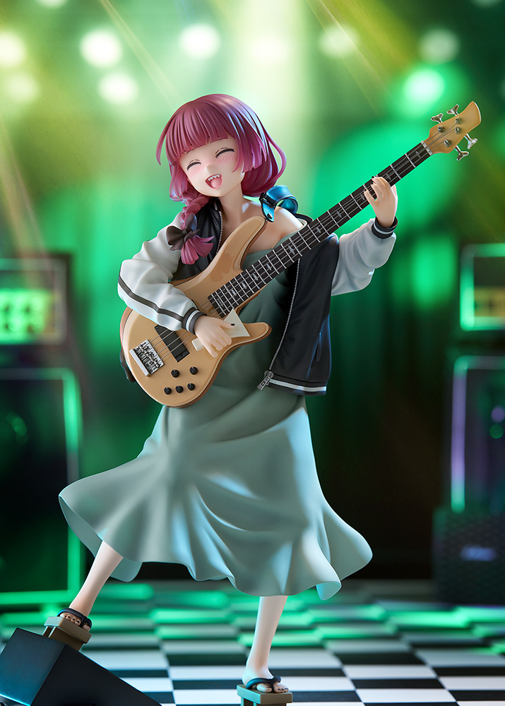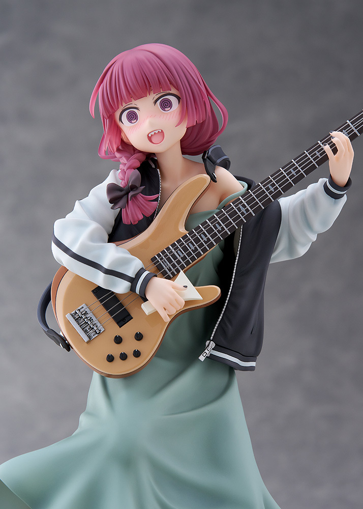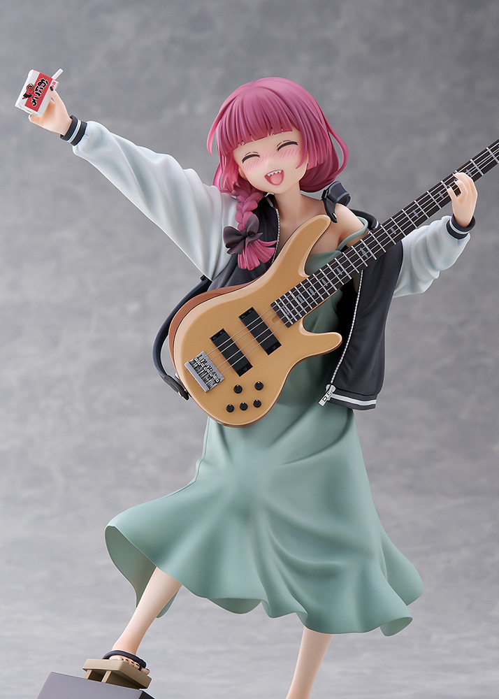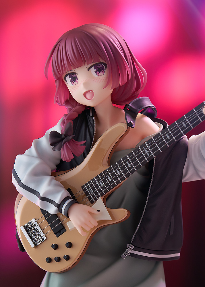 「Dream Tech 廣井菊理」1/7比例模型,尺寸全高約 24 公分,將在舞台上演出的 LIVE 場景立體化,傳著招牌的細肩帶連身裙搭配刺繡夾克,因為酒醉而肩帶鬆落,小露鎖骨與香肩、有點衣衫不整的模樣性感又帥氣!腳踩著木屐與手中的撥片、貝斯「超究極酒吞童子EX」的細節也忠實重現!