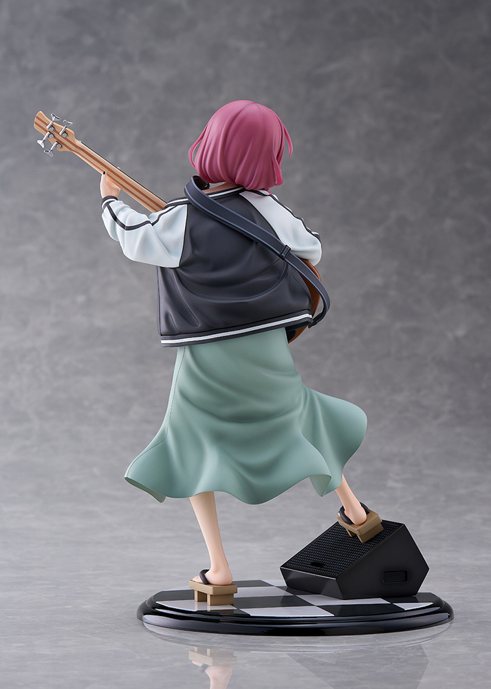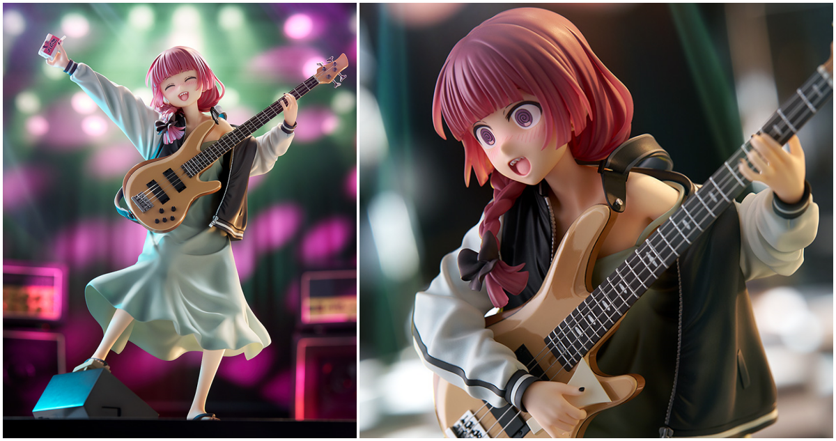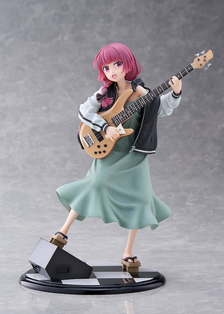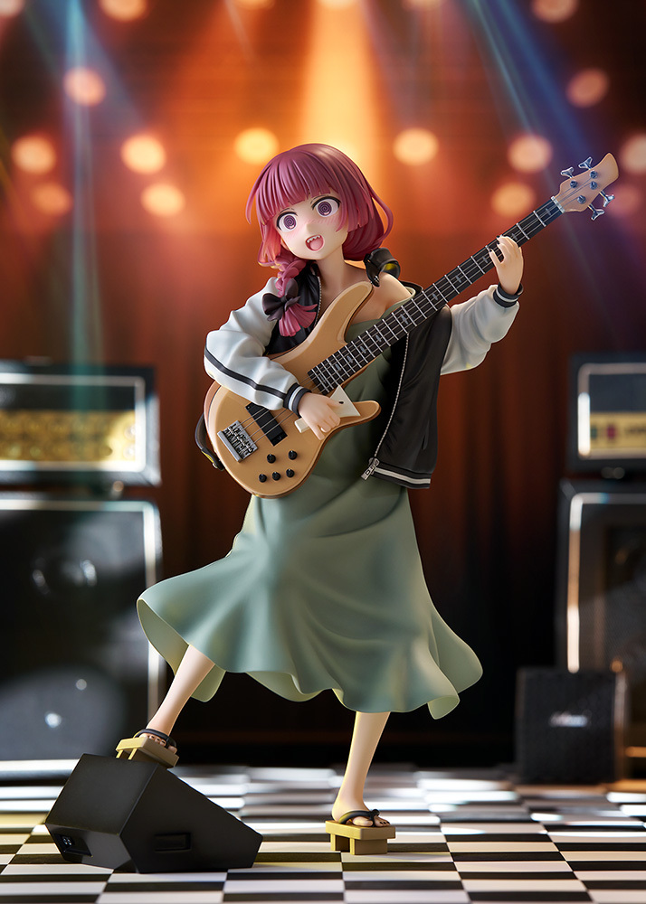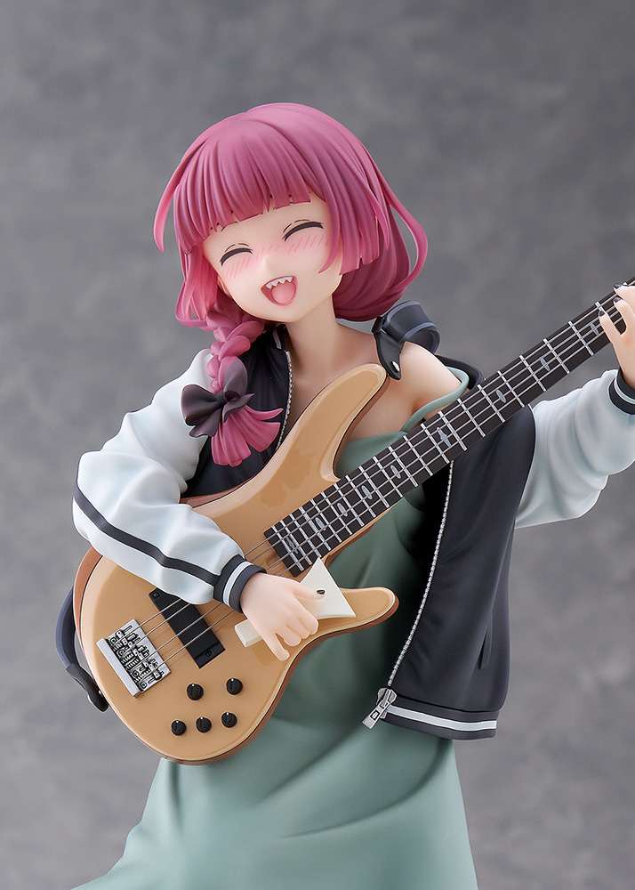「Dream Tech 廣井菊理」1/7比例模型,尺寸全高約 24 公分,將在舞台上演出的 LIVE 場景立體化,傳著招牌的細肩帶連身裙搭配刺繡夾克,因為酒醉而肩帶鬆落,小露鎖骨與香肩、有點衣衫不整的模樣性感又帥氣!腳踩著木屐與手中的撥片、貝斯「超究極酒吞童子EX」的細節也忠實重現!