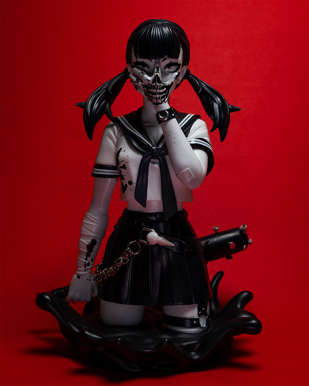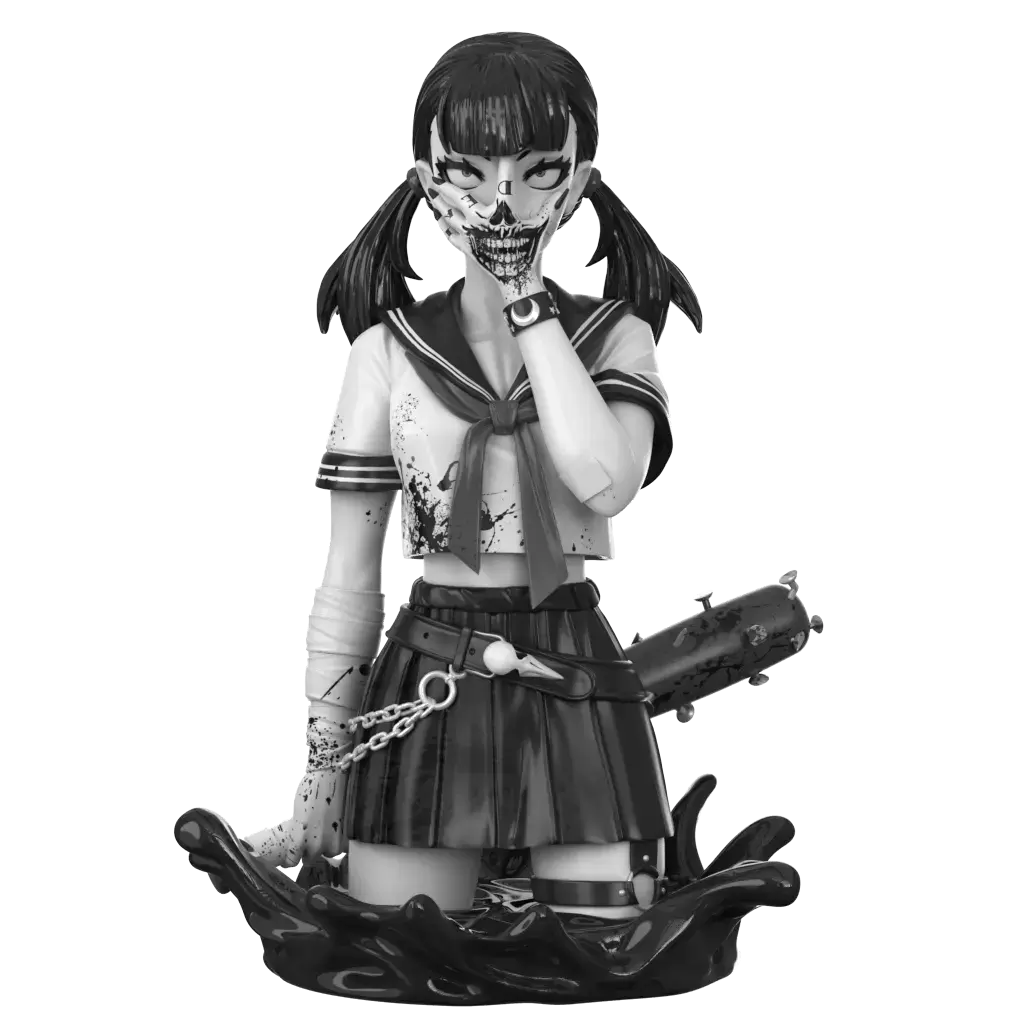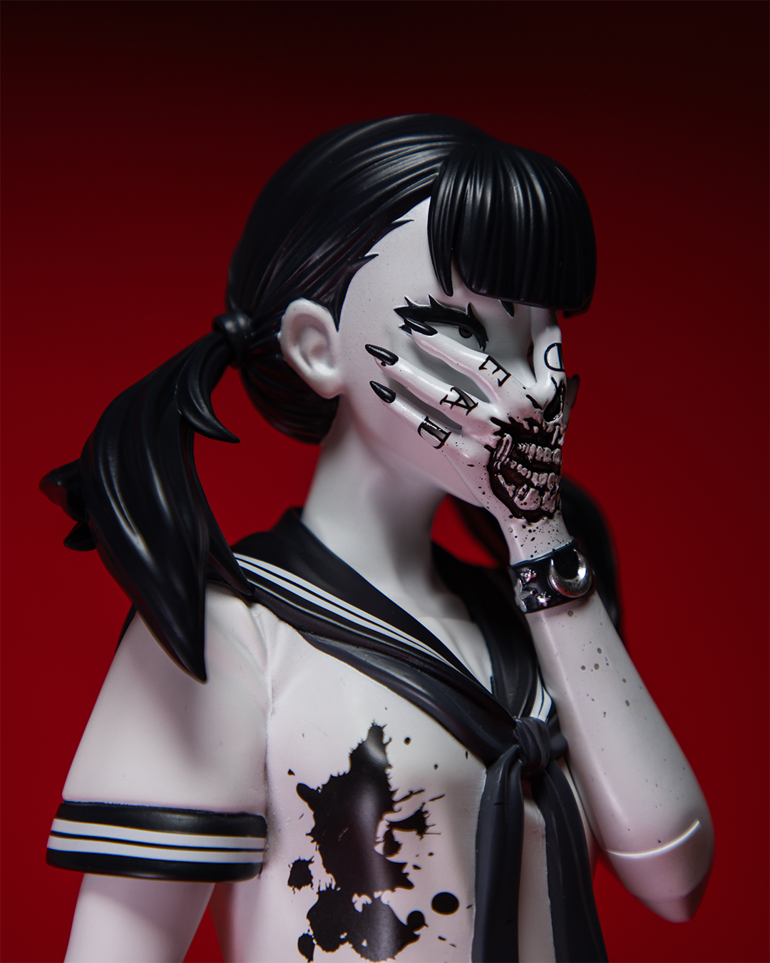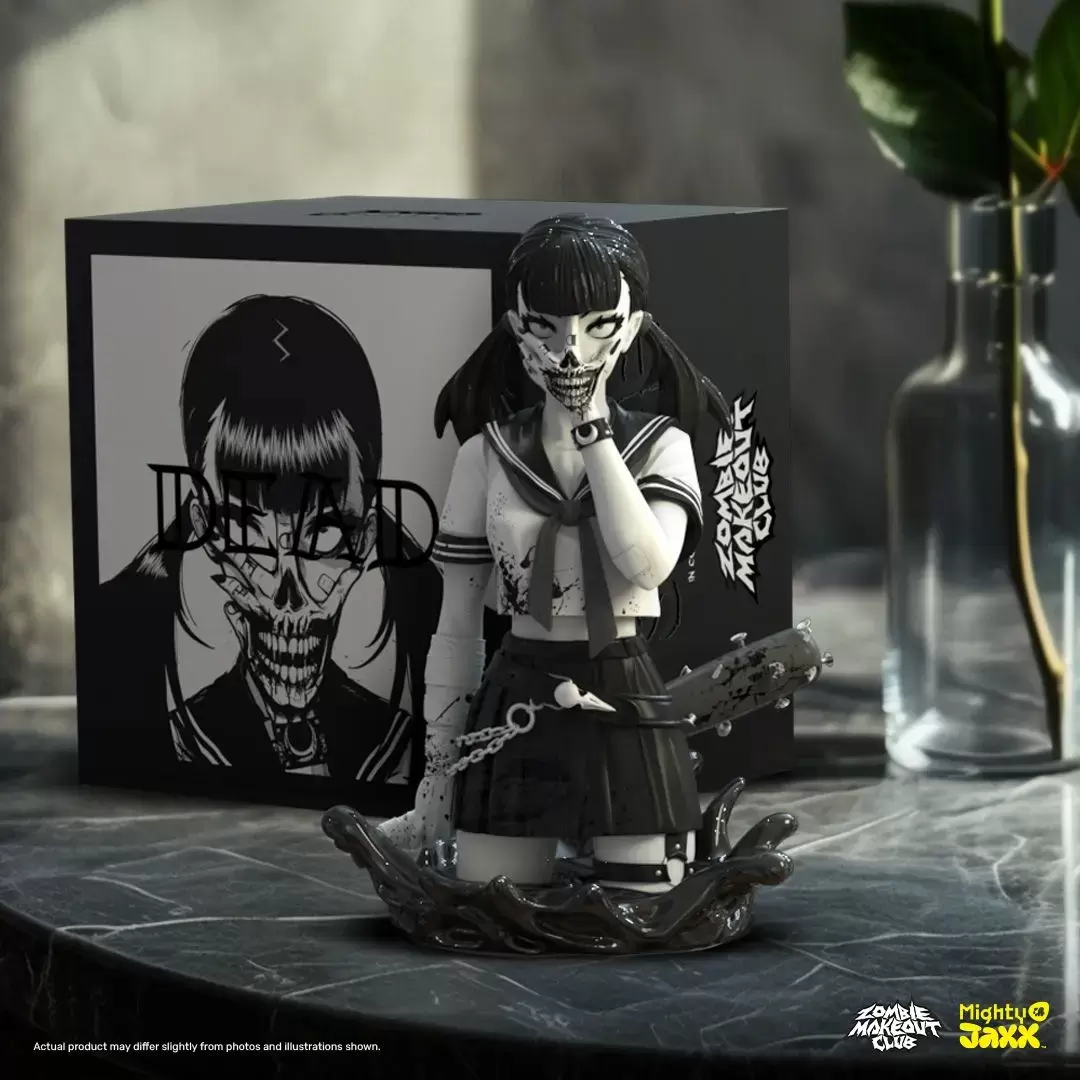 由藝術家 Peter Richardson 所創作的黑暗作品《Zombie Makeout Club》系列「死亡凝視(Death Stare)」,受到電影《自殺突擊隊》的啟發,描繪既美麗又恐怖,濃鬱的血腥龐克風格美學的制服美少女。她致命的目光、手背上裂嘴的刺青,令人忍不住多看一眼...