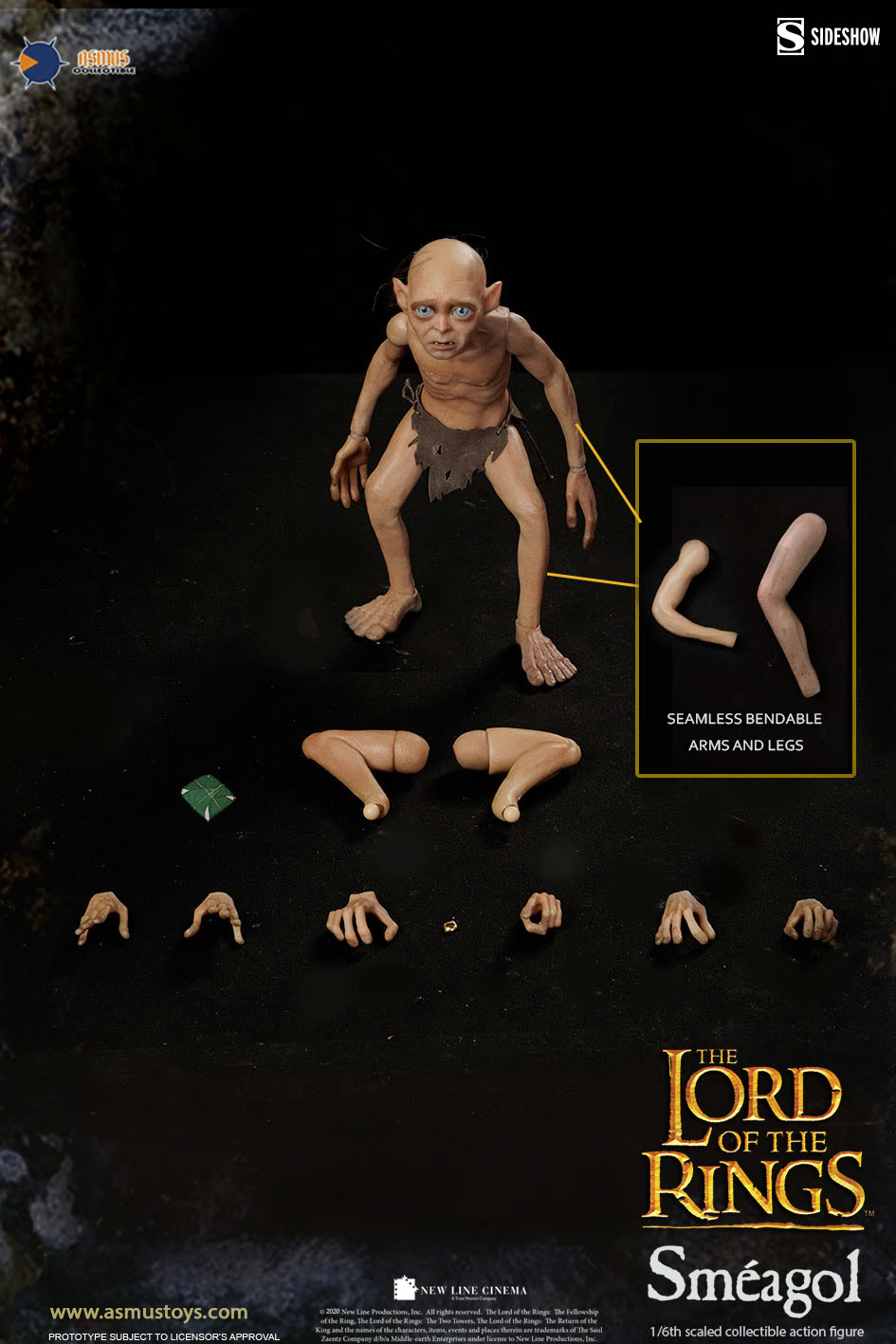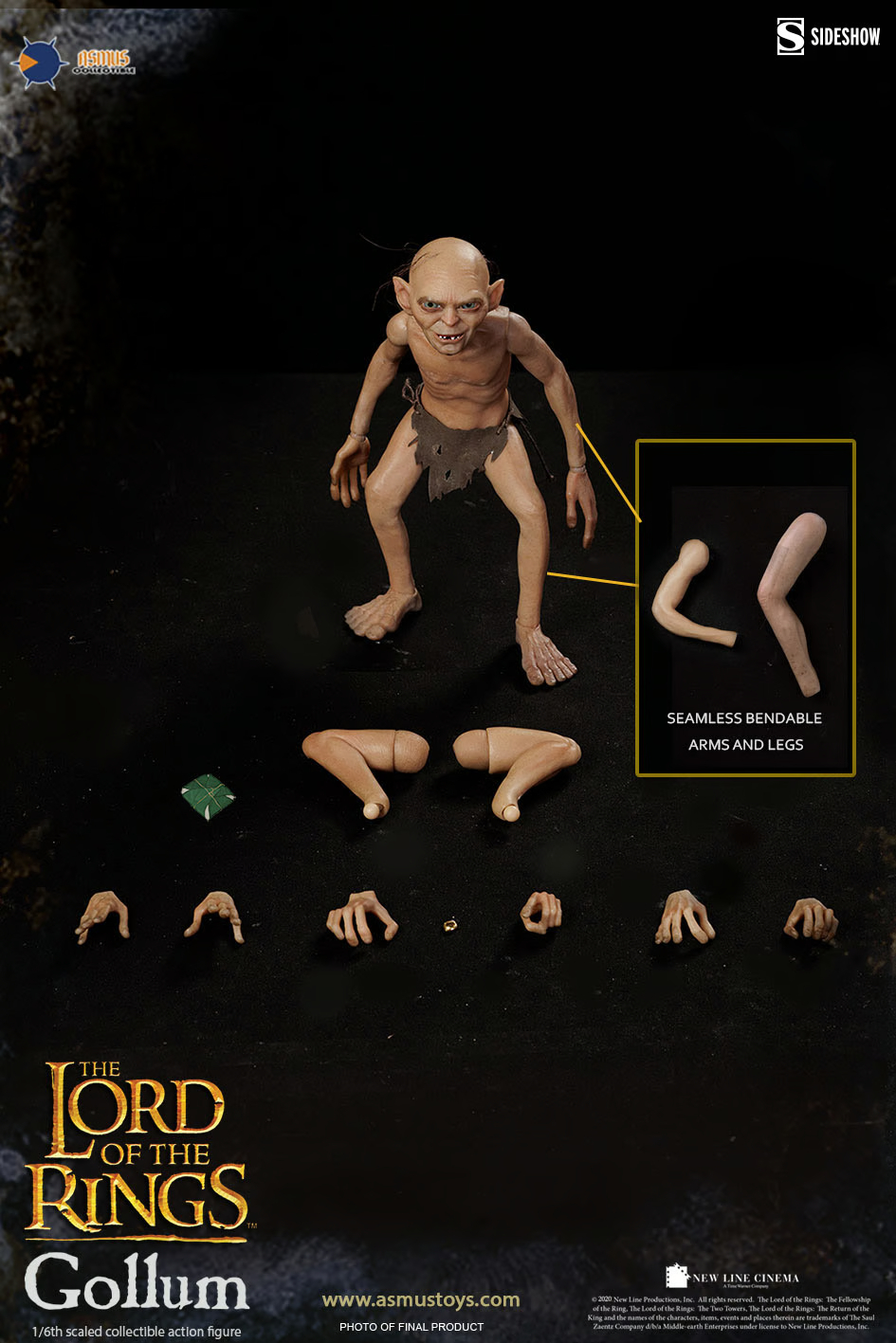 軀體部分考究再現了乾瘦的樣貌,可彎曲的雙手、雙腳採用無縫處理,帶來更具整體感的肌肉線條呈現,配件包含一對同樣採用無縫處理的彎曲雙腿、多個替換手、精靈食物蘭巴斯(Lembas)麵包,以及他的寶貝至尊魔戒(咕嚕與史麥戈兩者的配件內容相同)。