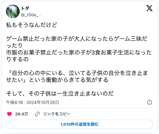 「我非常感同身受。在禁止打電動的家裡成長的孩子,長大後會不斷地打電動,在禁止吃零食的家裡長大的孩子,長大後也有可能會變成一天三餐都要吃零食的模樣。