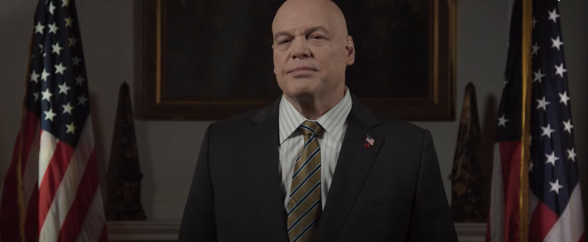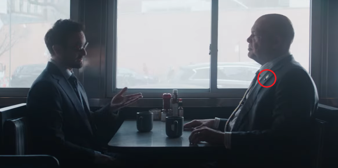 此外,可以注意到金霸王的西裝上別有美國國旗徽章,後面也能見到他以這身姿態在國會演說,這顯示他目前已經擁有政治權力,呼應《回聲女》結局中他萌生了競選市長的念頭。