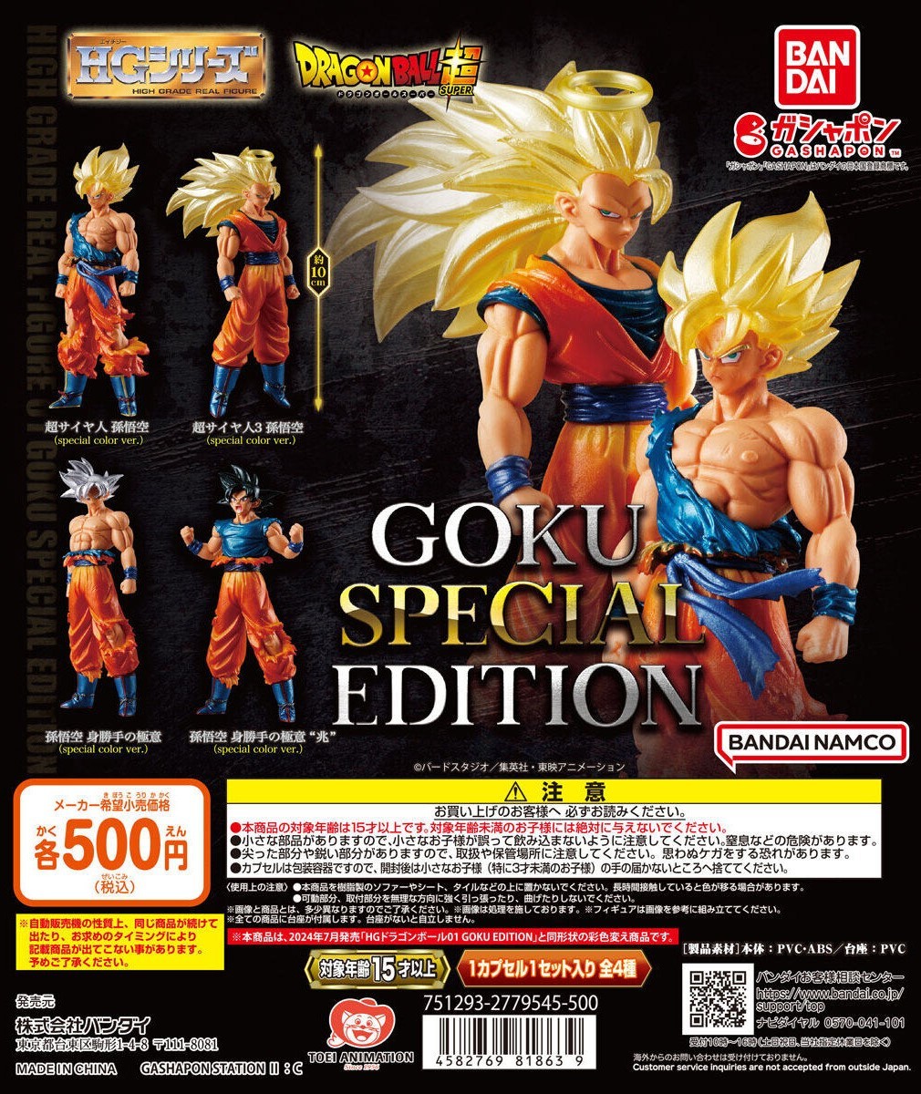 以今年 07 月好評發售的「HG七龍珠01 GOKU EDITION」為基礎,本次推出的「HG 七龍珠01 GOKU SPECIAL EDITION」轉蛋將超級賽亞人悟空、超級賽亞人 3 悟空、悟空無我極境、悟空 無我極境兆 4 種悟空,換上了金屬塗裝的special color ver.豪華規格!將角色的魅力濃縮成總高度約 10 公分的精緻收藏,服裝與肌肉(還有乳首)的細節都非常細膩!