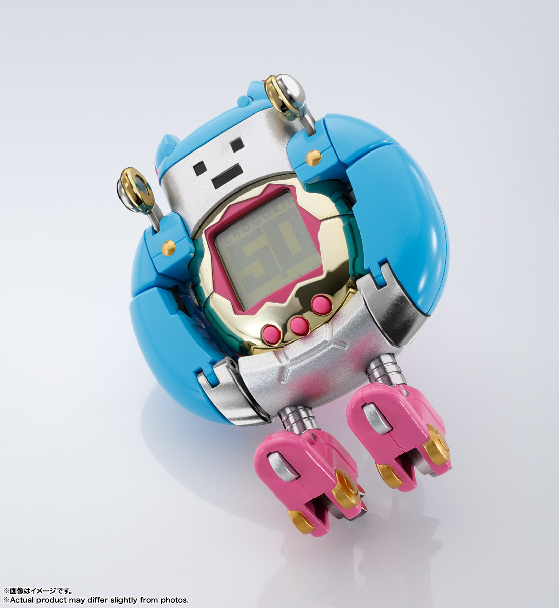 超合金『CHOGOKIN 塔麻可吉機器人』,尺寸全高約 10 公分,以紀念超合金 50 周年的「Original Tamagotchi」為核心,除了採用電鍍金呈現出合金質感之外,連遊戲畫面都有原創的超合金 50 周年紀念標誌!與機器人本體結合,延伸出塔麻可吉機器人頭部與爪子手的機械手臂,腳部是溜冰鞋般的造型,復古又可愛!
