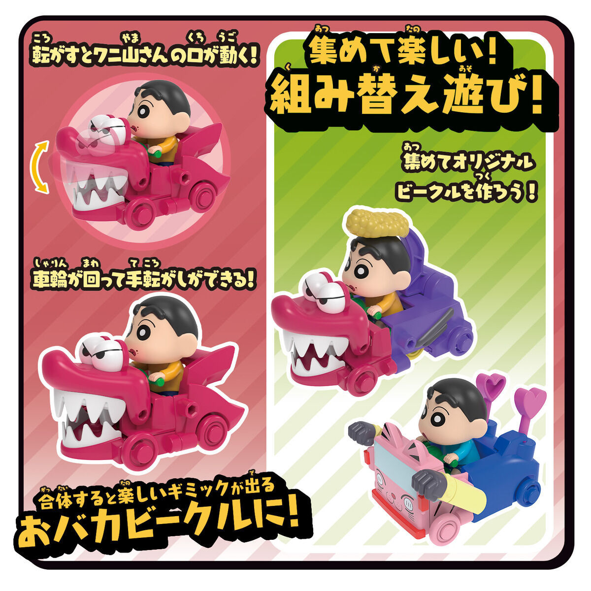 本作是主打可以將騎著三輪車的蠟筆小新角色們與各式車輛組裝、打造出多種樣貌,買多越好玩的客製化載具系列,讓你在收藏角色的同時也藉著造型奇特的車輛進一步感受《蠟筆小新》的世界觀,只要是冠上 おバカスタムビークル 之名的玩具都能相互搭配。將在 12 月初登場的春日部防衛隊系列②收錄有正在吃巧克比的「小新」、「阿呆」、「風間」三位角色,在 5 公分的迷你尺寸中展現出生動活潑的表情與充滿奇想的載具,隨著輪子開始轉動、每台車還有各自不同的效果喔!