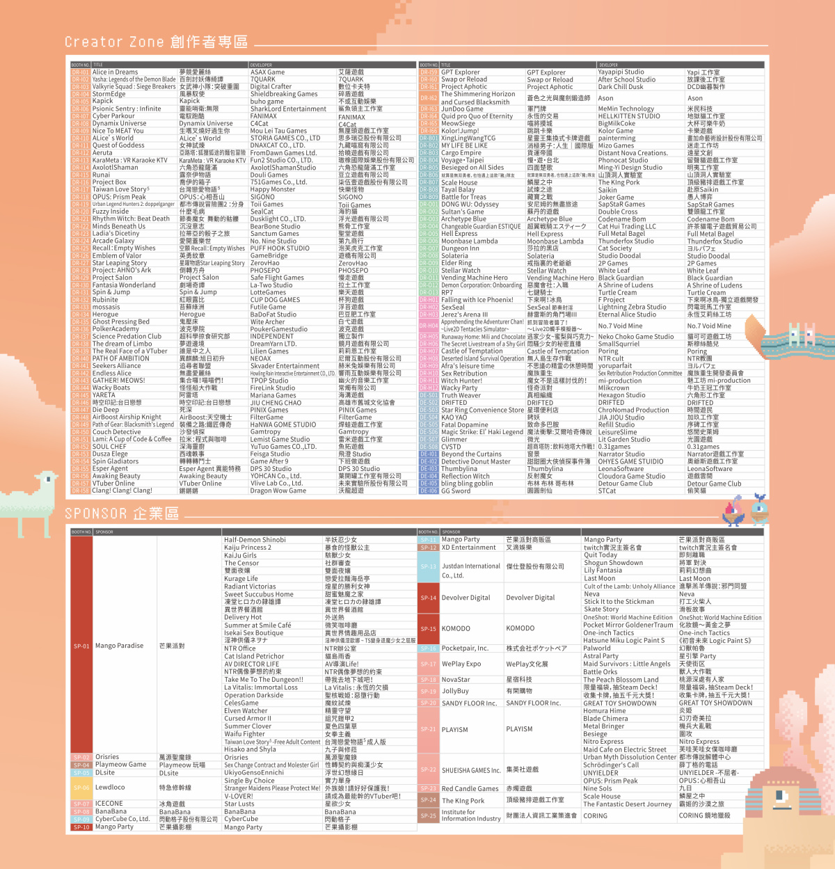● 贊助廠商:芒果派對、株式会社 KOMODO、 Devolver Digital, Pocketpair、特急修幹線、viviON Inc.、傑仕登股份有限公司、閃動格子、華義國際、Playism、赤燭遊戲、SHUEISHA GAMES Inc.、Sandy Floor、莓卡遊戲、冰角數位、有閑數位科技、星宿科技、JustDance2025、 TWITCH、Playmeow 玩喵、財團法人資訊工業策進會。
