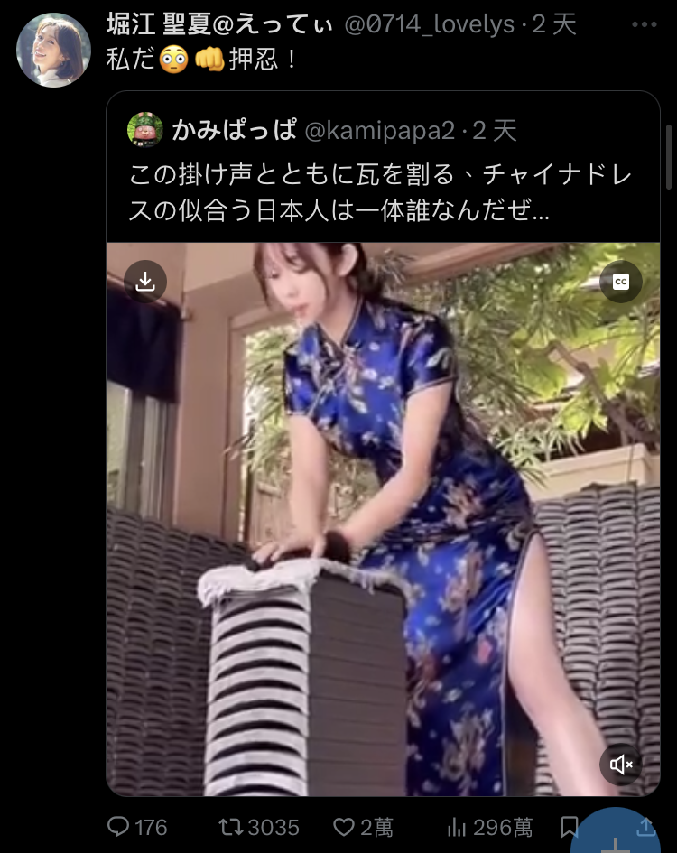 近日日本 X 上有位播報員-堀江聖夏,因為常在社群上分享自己過去身為空手道黑帶,穿上旗袍展現劈瓦絕技的帥氣姿態,在日本網路上大為爆紅,不少人都驚訝看似瘦弱的堀江聖夏,居然有如此強大的武術能耐,大讚根本是日本最強播報員。