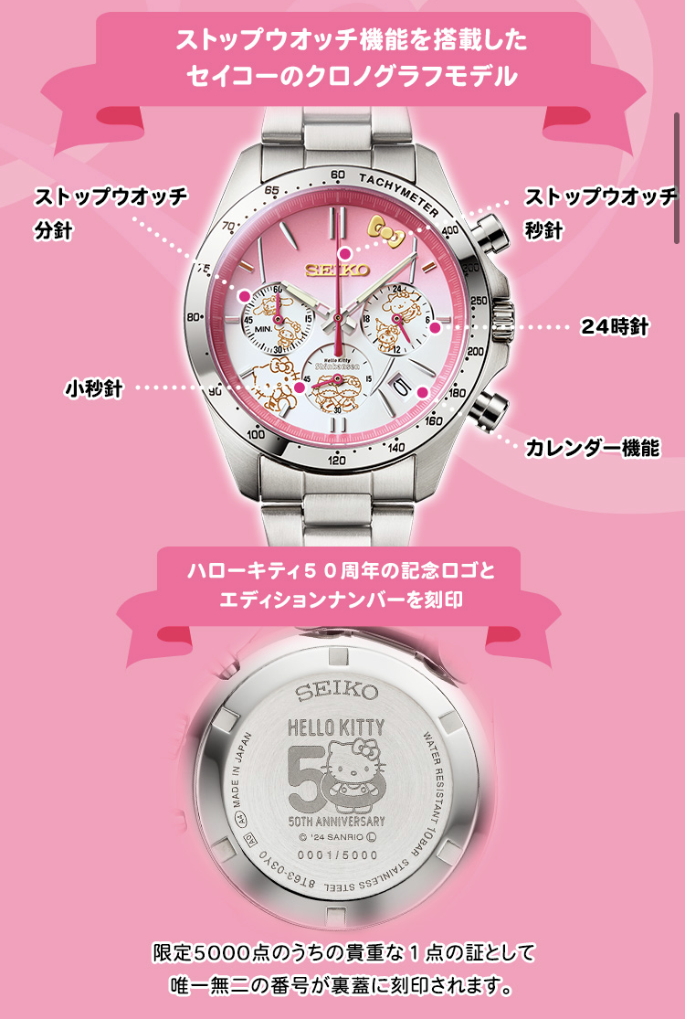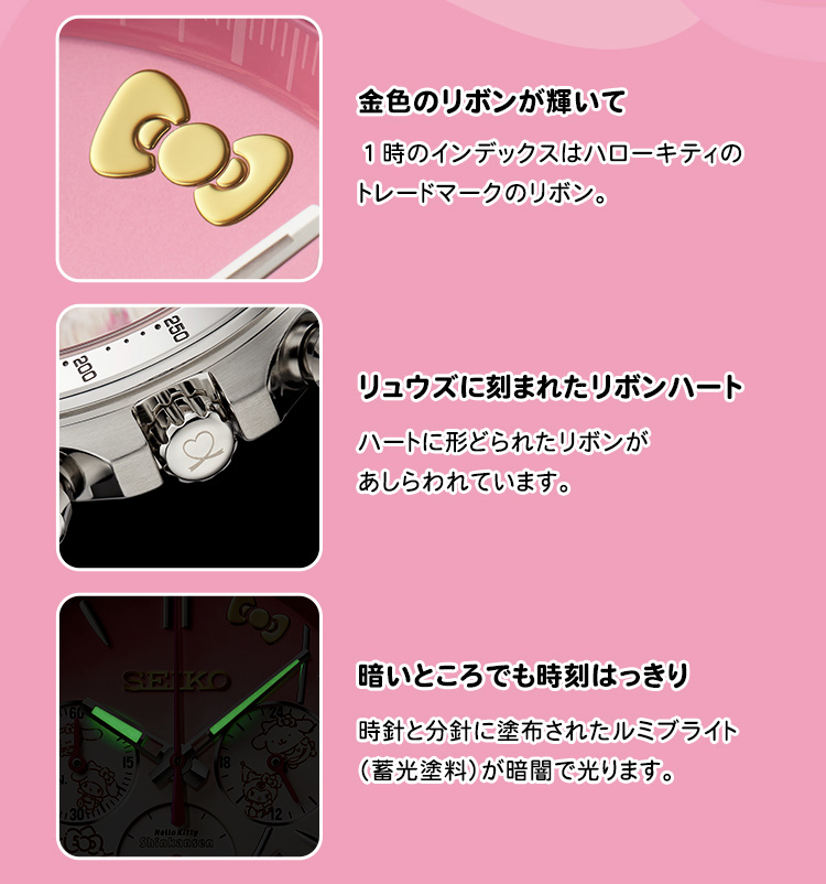 這次周年聯名錶款,選擇以 2018 年開始行駛,在新大阪~博多間運行的 500 系「Hello Kitty 新幹線」為設計靈感,錶盤採用漸層的粉紅色為背景,有著 kitty 與招牌的蝴蝶結圖案,三眼盤面也有著其他三麗鷗角色好朋友,錶背也有 50 周年的紀念 Logo,絕對是三麗鷗粉絲值得擁有的專屬收藏。