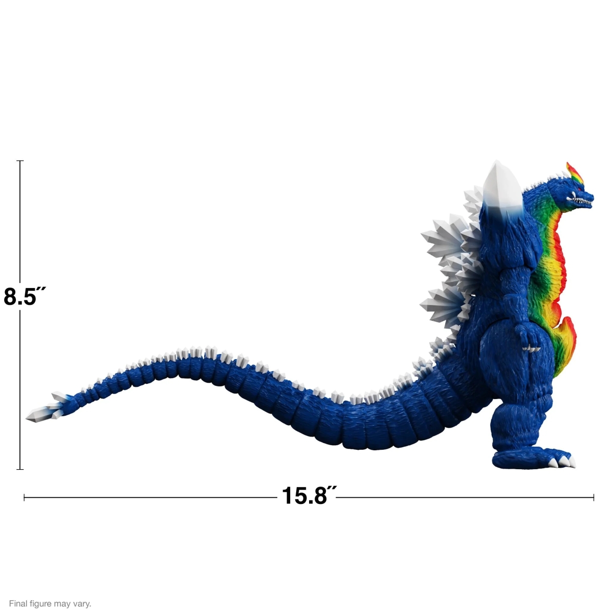 本次在「東寶 (Toho) ULTIMATES!」系列立體化的太空哥吉拉高約 21.5 公分、全長則來到 40 公分極具存在感,而且這回宇宙兇惡戰鬥獸的配色方案是依照《哥吉拉vs太空哥吉拉》電影海報為題製作,軀幹主要以紅、黃、綠色為主,展現出彷彿高熱能的漸層感,四肢、頭部、尾巴以藍色為主調,整體有著復古玩具的視覺效果;配件包含一個怒吼的替換頭雕、額外的兩對替換手,標有「破壞神降臨」的包裝外盒也是帥到不行啊!
