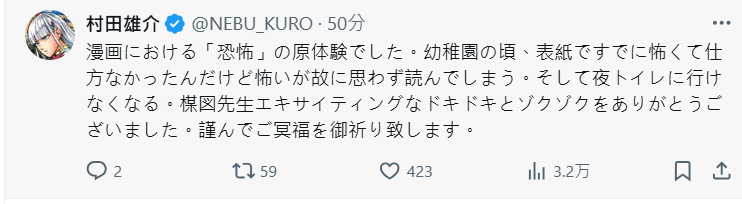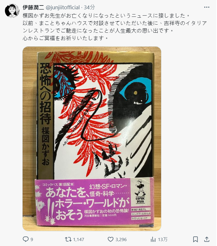 連漫畫家村田雄介也表示,自己幼稚園時就已經被楳圖老師作品的封面嚇到了,雖然害怕,還是忍不住讀了它,結果晚上還不敢去上廁所。感謝前輩您為我們帶來了令人興奮的體驗,謙卑地祈禱他的靈魂安息。