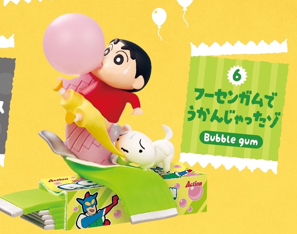 本次的盒玩以零食為主題結合小新的各種逗趣形象製作角色模型,分別收錄小新躲藏在霜淇淋包裝裡的「巨大的霜淇淋喔~」;興奮的淹沒在巧克力餅海裡的「一個人獨享巧克力餅喔~」;吃著超大貓咪校車造型甜甜圈的「穿過甜甜圈喔~」;在肥嘟嘟佐衛門杯麵裡游泳的「泡在麵裡暖呼呼喔~」;穿著動感超人服裝從洋芋片包裝飛出來的「飛出洋芋片喔~」;以及吹著泡泡糖飛起被小白拉住褲子的「被泡泡糖吹飛了喔~」六種款式。每一款小新的動態都相當生動有趣,搭配充滿各種彩蛋的點心細節超級可愛!小編尤其喜歡小新因為吹泡泡而飄起的造型,小白那個咬著褲子看起來很困擾的表情有夠讚!喜歡蠟筆小新的玩具人不要錯過啦!