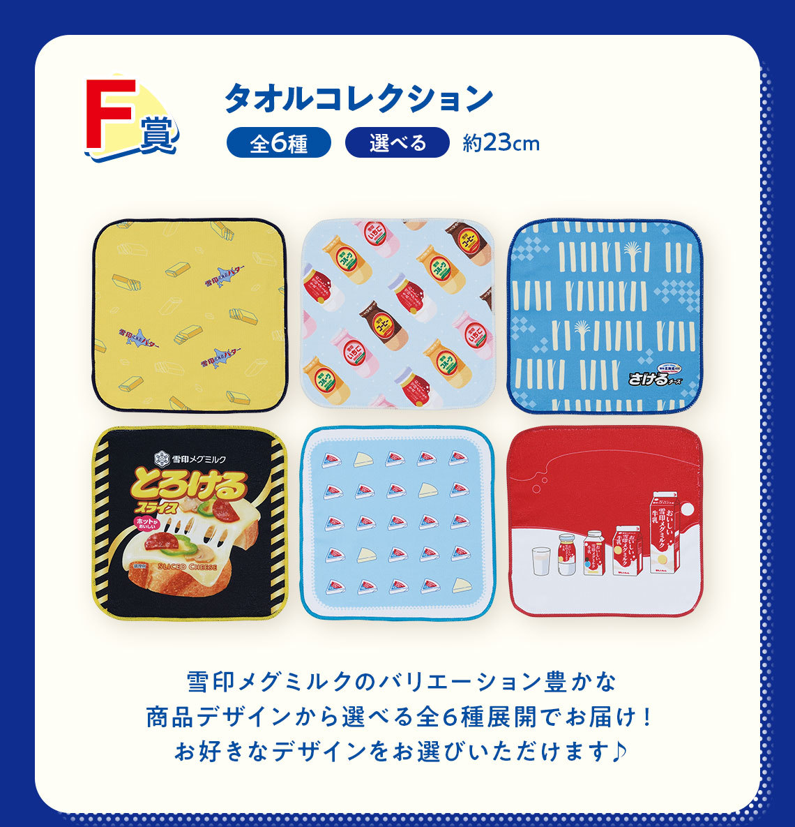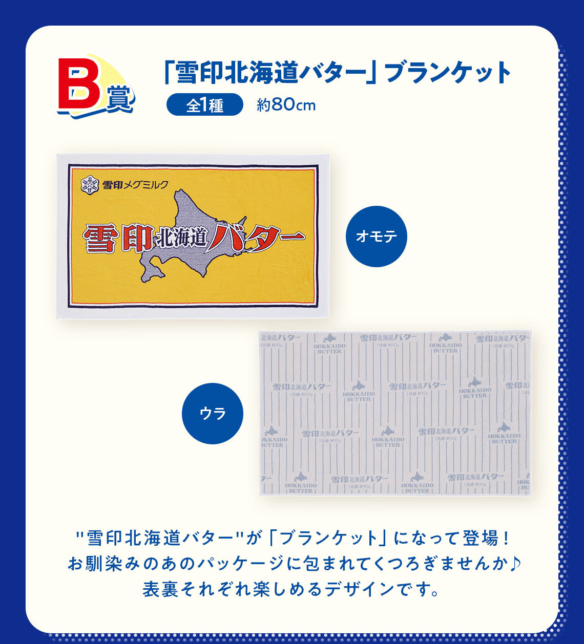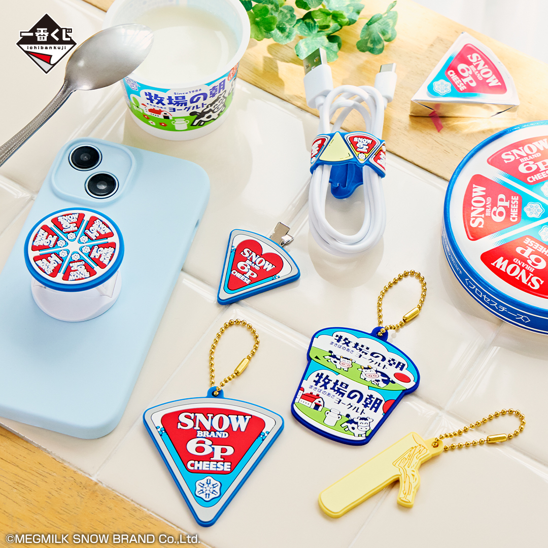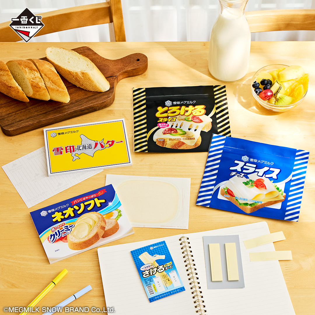 「一番賞 雪印 MEGMILK」,以雪印 MEGMIL 旗下製販的食品為主題,將雪印北海道拉撕起司、雪印北海道奶油等人氣商品化為生活用品!收錄有 A 賞~ H賞+最後賞、雙重中獎機會等豐富的獎項,分別為:82公分大的 A賞「雪印北海道拉撕起司抱枕」、B賞「雪印北海道奶油毛毯」、C賞「牧場の朝手提包」、D賞「玻璃收藏品」、E賞「冰箱收納盒」、F賞「毛巾系列」、G賞「文具系列」、H賞「橡膠系列」,以及最後賞的「「6P 起司墊毯」!讓喜愛的美味食品充斥在生活日常~