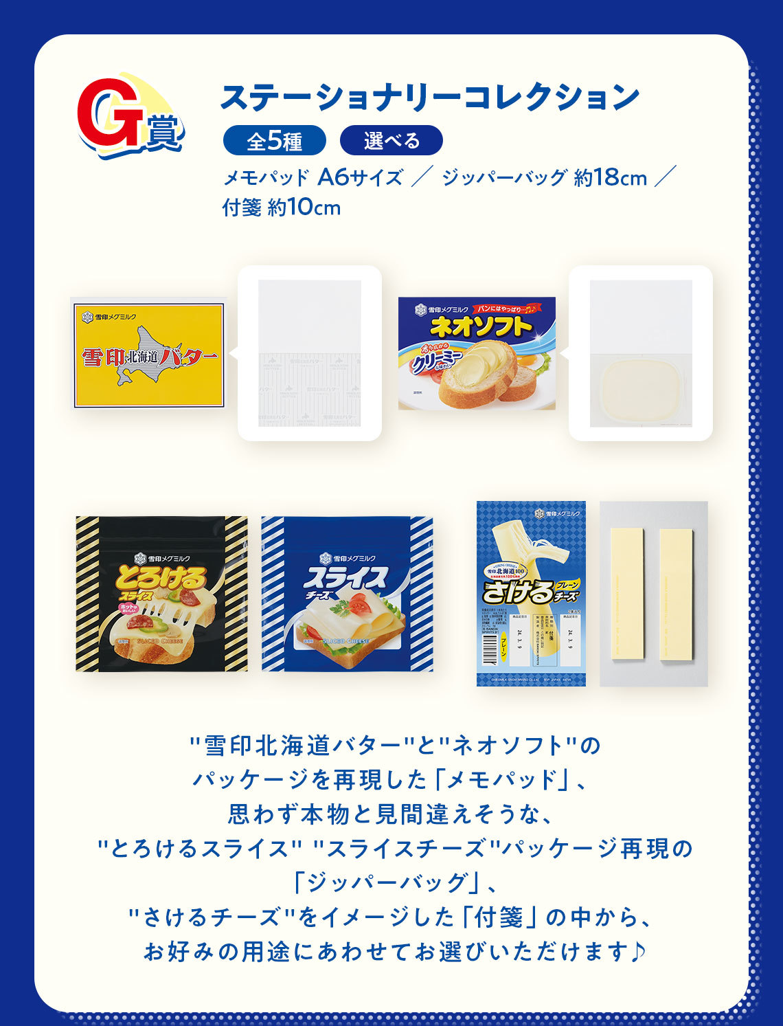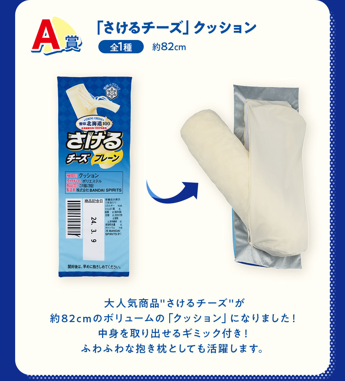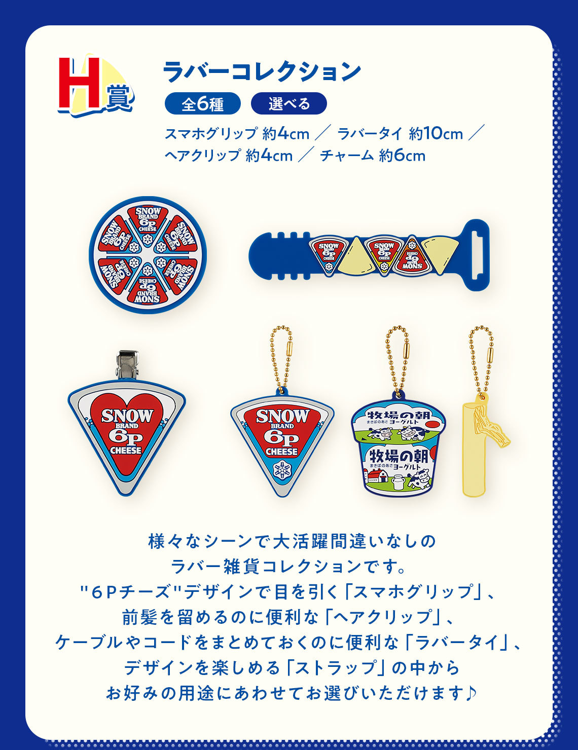 「一番賞 雪印 MEGMILK」,以雪印 MEGMIL 旗下製販的食品為主題,將雪印北海道拉撕起司、雪印北海道奶油等人氣商品化為生活用品!收錄有 A 賞~ H賞+最後賞、雙重中獎機會等豐富的獎項,分別為:82公分大的 A賞「雪印北海道拉撕起司抱枕」、B賞「雪印北海道奶油毛毯」、C賞「牧場の朝手提包」、D賞「玻璃收藏品」、E賞「冰箱收納盒」、F賞「毛巾系列」、G賞「文具系列」、H賞「橡膠系列」,以及最後賞的「「6P 起司墊毯」!讓喜愛的美味食品充斥在生活日常~