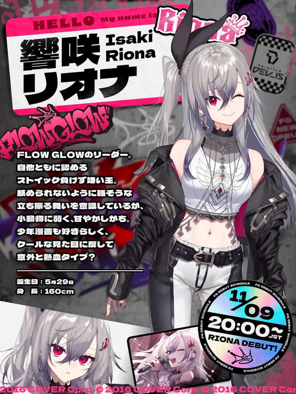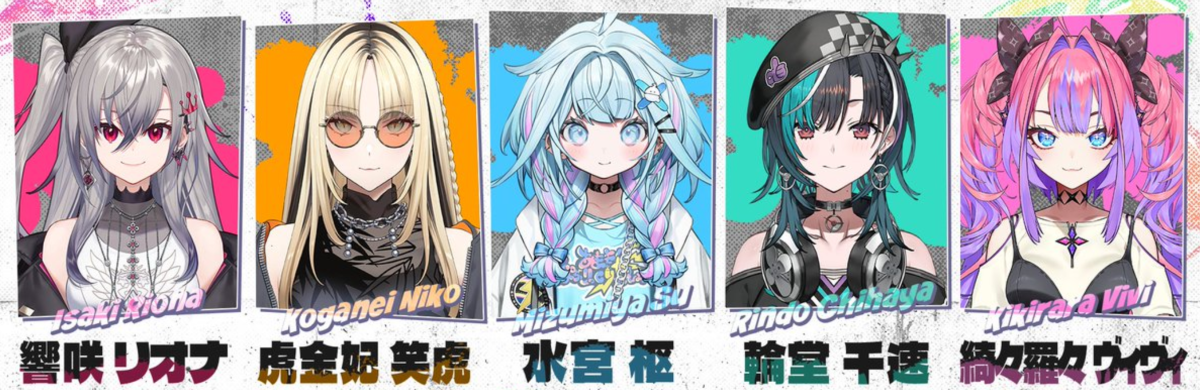 這次的『Hololive FLOW GLO 』將會是隸屬於團體 hololive DEV_IS,為先前『Hololive ReGLOSS 』的後輩。五位成員名為 : 「響咲リオナ」、「虎金妃笑虎」、「水宮枢」、「輪堂千速」與「綺々羅々ヴィヴィ」,可以看出五位成員目前視覺設計上有走的是街頭服裝味道,跟先前 ReGLOSS 出道時的團體服裝造型設計不太相同。