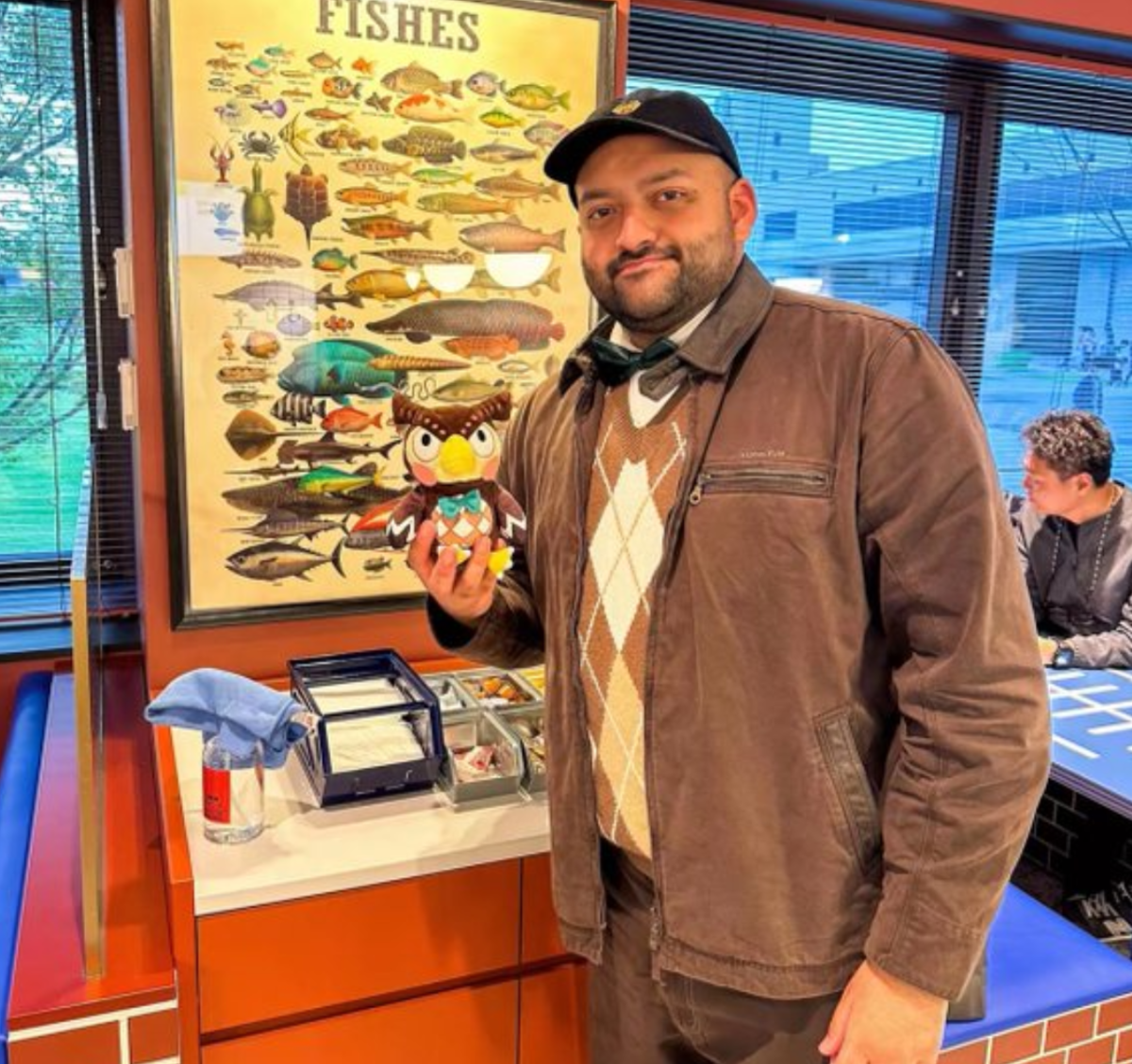 日本推主分享,這位海外粉絲 May 穿得跟傅達幾乎一模一樣,咖啡色的外套搭配內裡的格紋毛衣,還有傅達招牌的綠色領結,手持著傅達娃娃到日本旅遊,並參觀任天堂博物館,真的是太可愛又用心了。