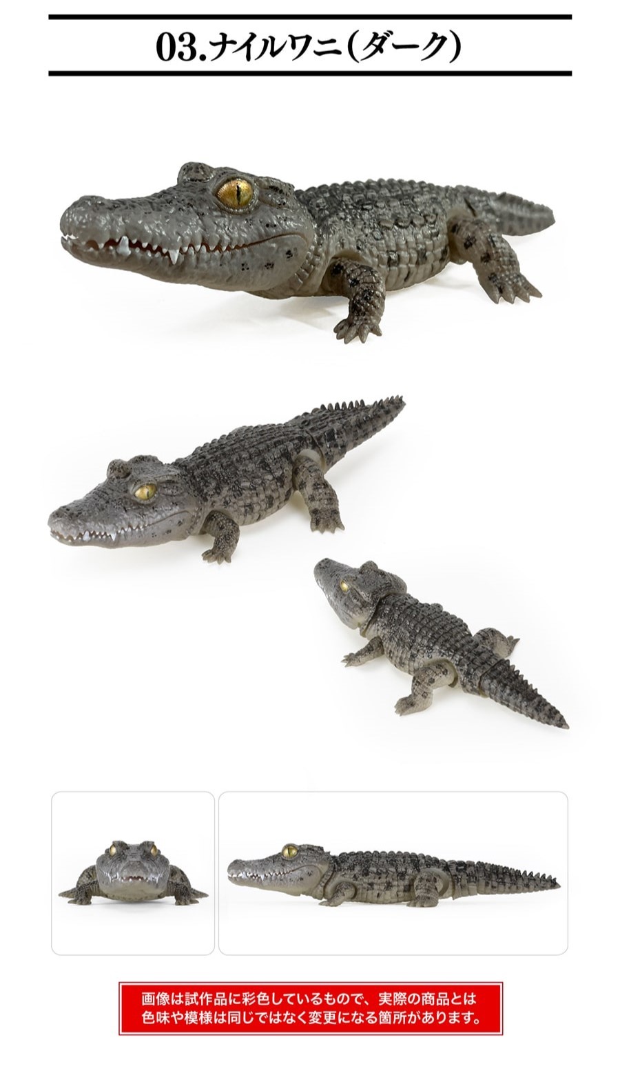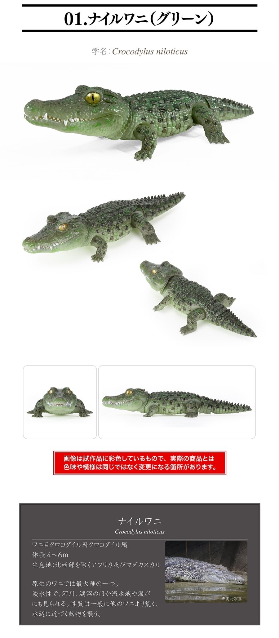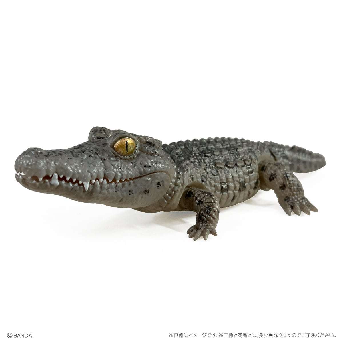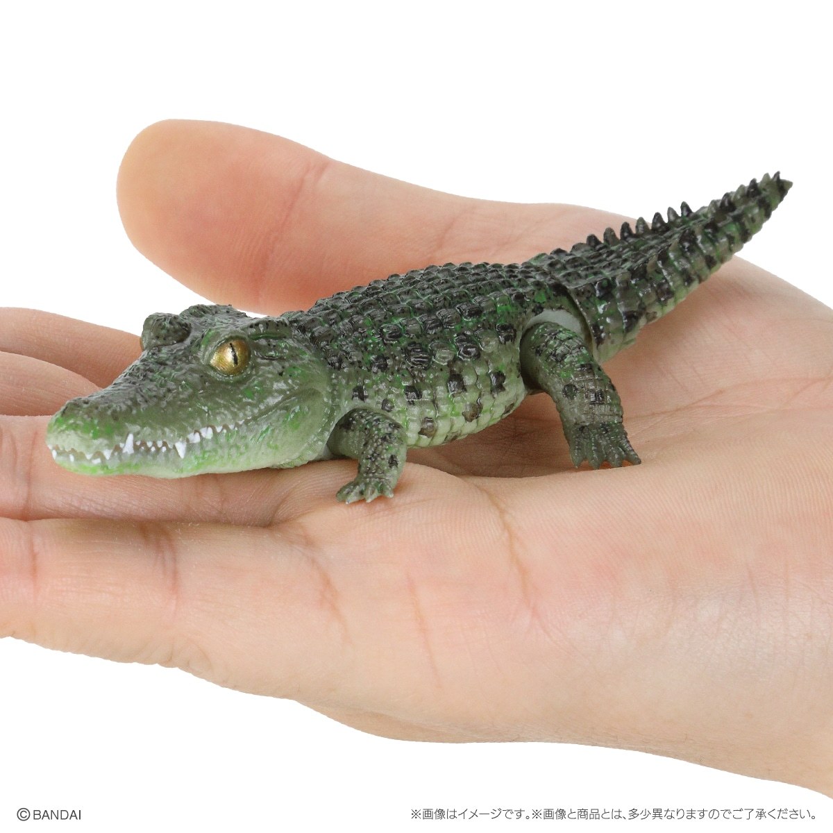 公分的轉但尺寸中逼真地還原鱷魚鋒利的牙齒與特色的外皮質感,水亮的光澤與特殊的花紋等色彩也是忠實呈現。在嘴、頸部、尾部等 7 處設計有簡易的可動關節,可以賞玩張口威嚇的模樣!收錄有:綠、灰、深色三種體色的尼羅鱷與灰、深色兩種體色的恆河鱷,雖然目光銳利但可以放在手心的鱷魚寶寶尺寸,還是讓整體顯得相當可愛!