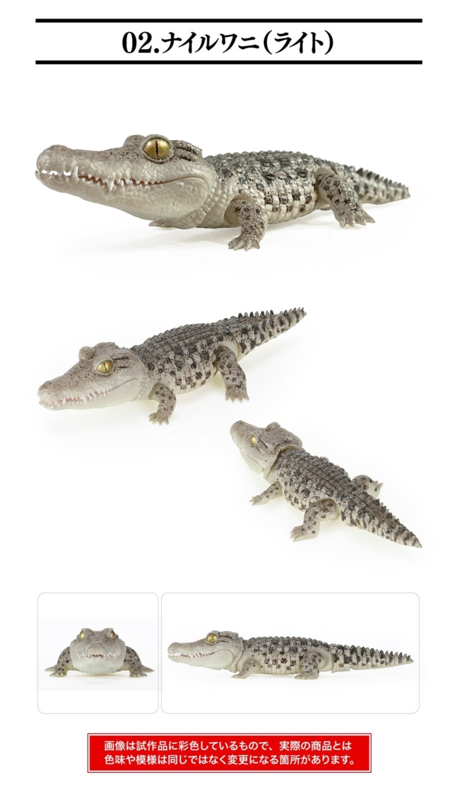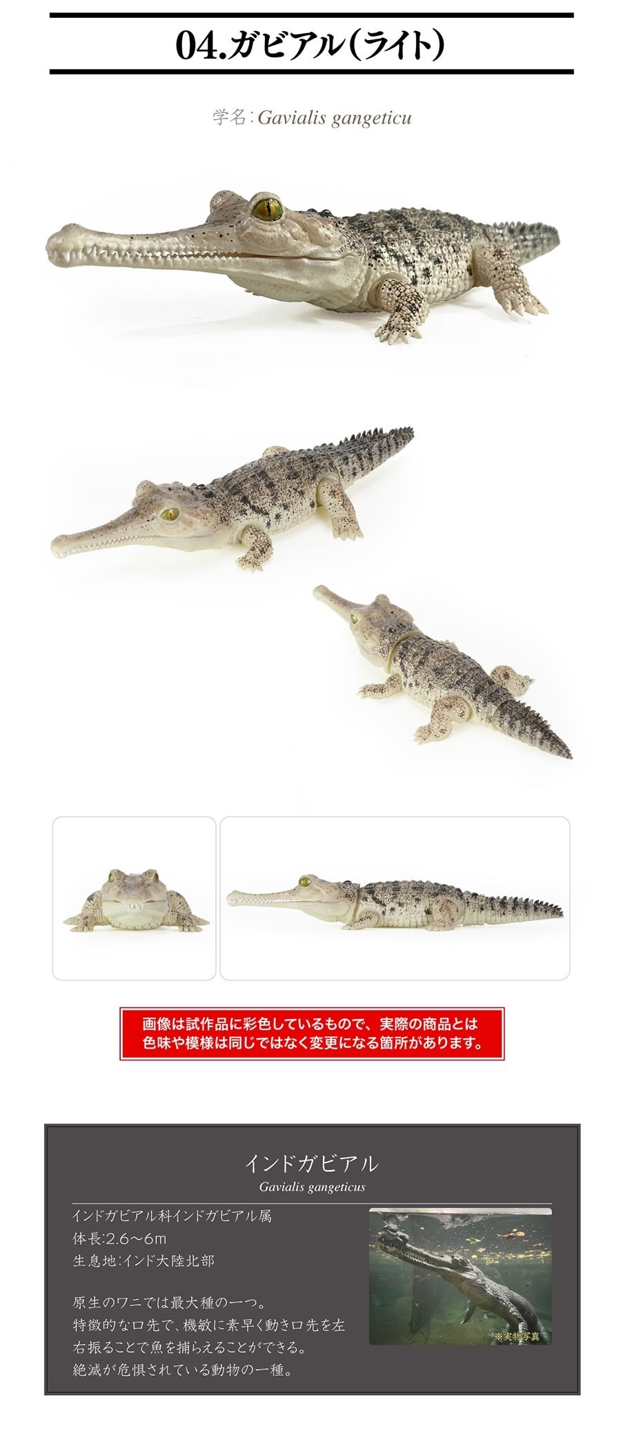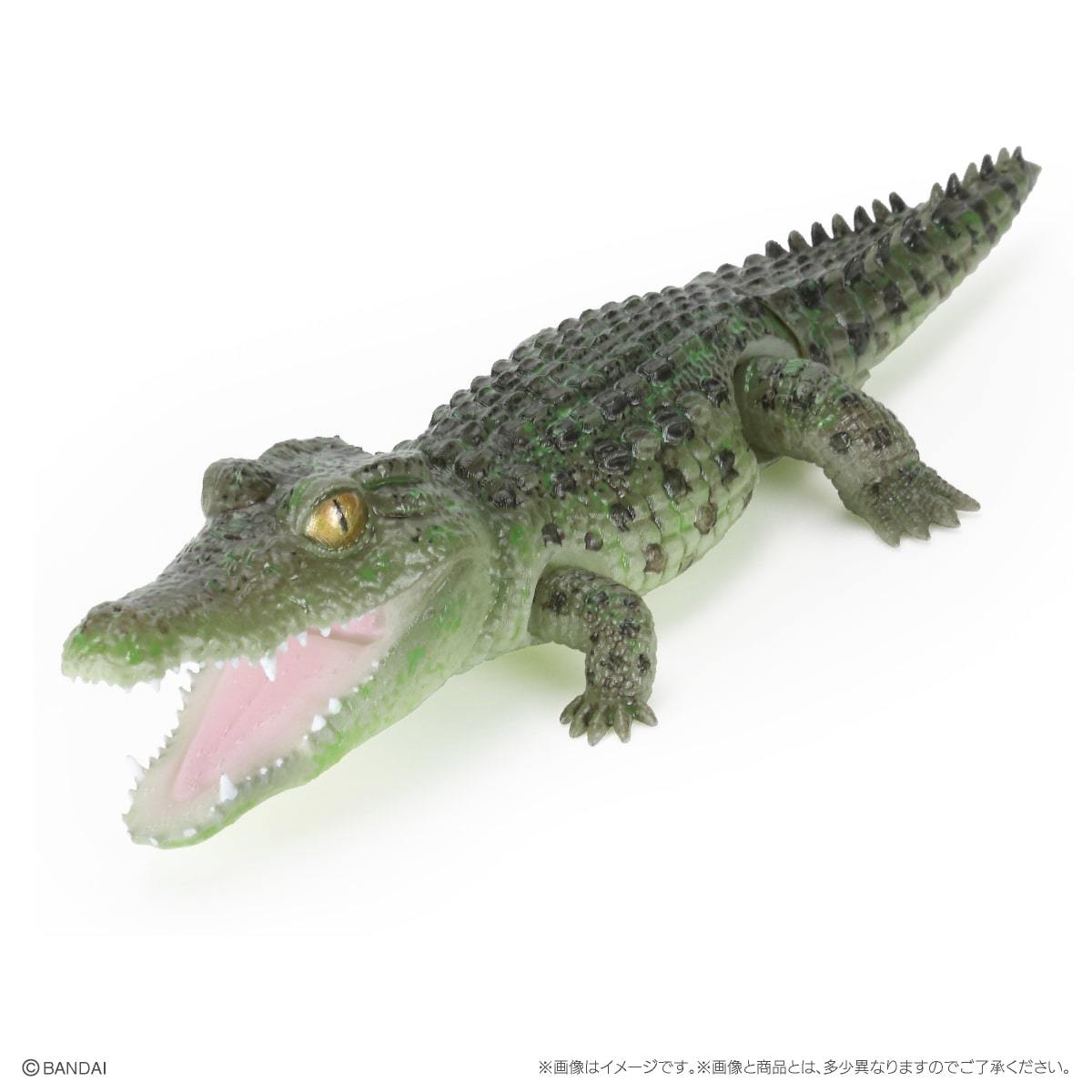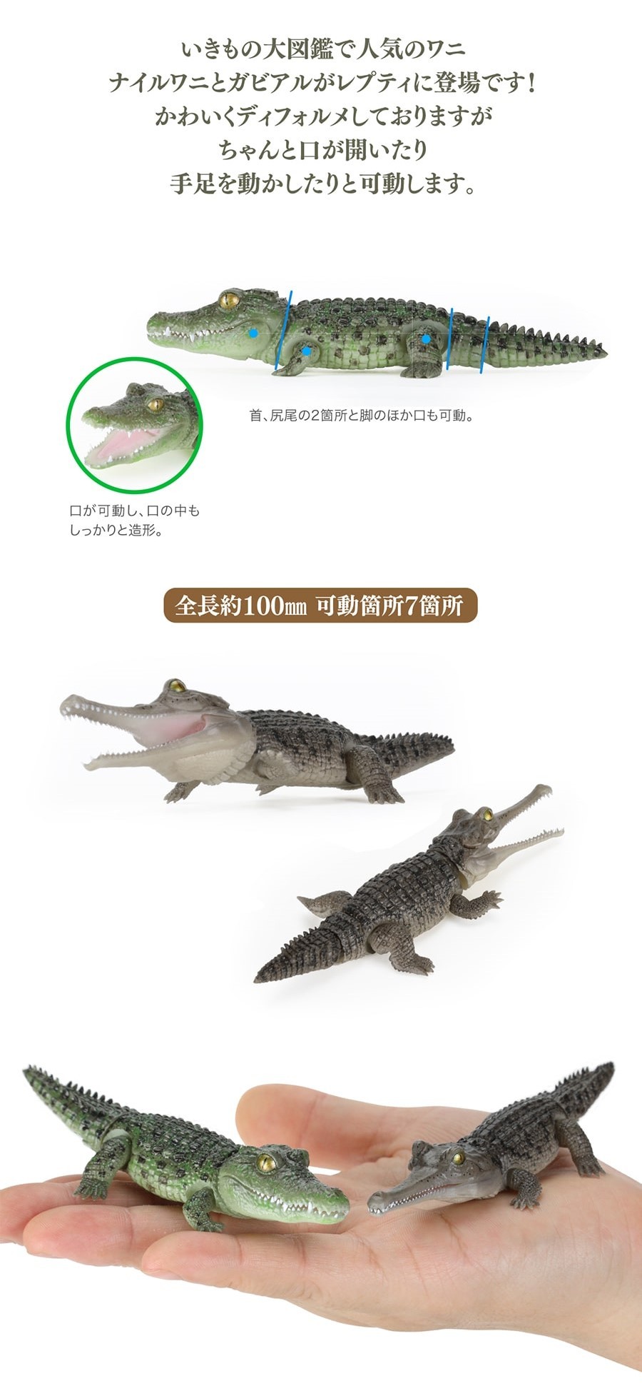 公分的轉但尺寸中逼真地還原鱷魚鋒利的牙齒與特色的外皮質感,水亮的光澤與特殊的花紋等色彩也是忠實呈現。在嘴、頸部、尾部等 7 處設計有簡易的可動關節,可以賞玩張口威嚇的模樣!收錄有:綠、灰、深色三種體色的尼羅鱷與灰、深色兩種體色的恆河鱷,雖然目光銳利但可以放在手心的鱷魚寶寶尺寸,還是讓整體顯得相當可愛!