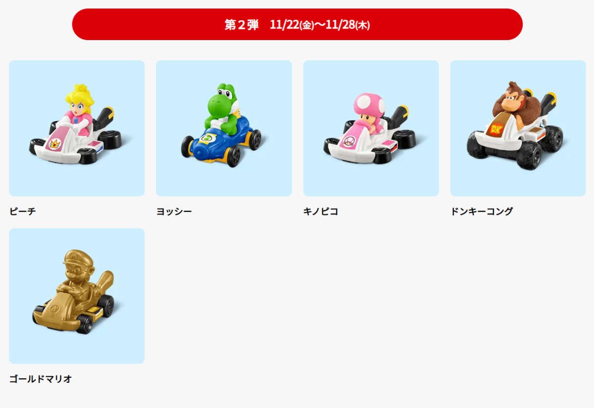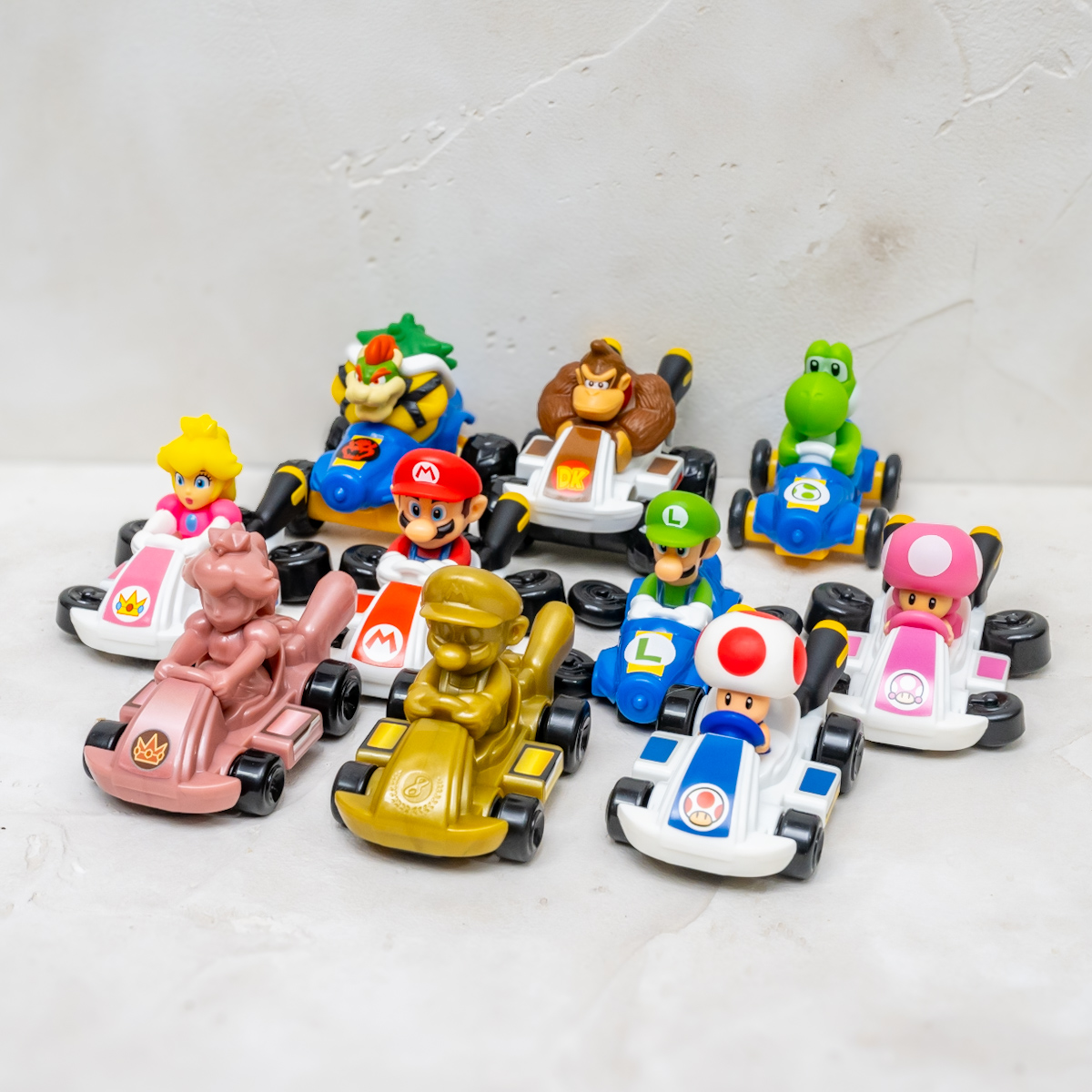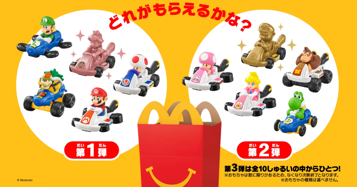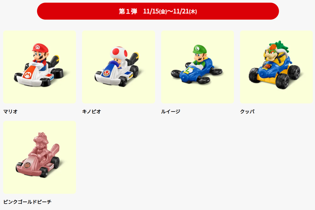 這次推出的贈品玩具是瑪利歐賽車,共計 10 款將在活動中作為快樂兒童餐贈品,以活動期間分成三彈依序推出,第一彈與第二彈會分成五個五個贈送,第三彈起則是 10 款都有機會獲得。