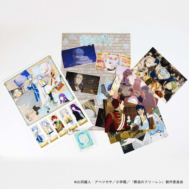 包含 110 日圓的特製郵票五張,還有台紙、以及隨機配置的五張動畫名場面明信片,以及印有芙莉蓮郵票圖案的壓克力鑰匙圈。