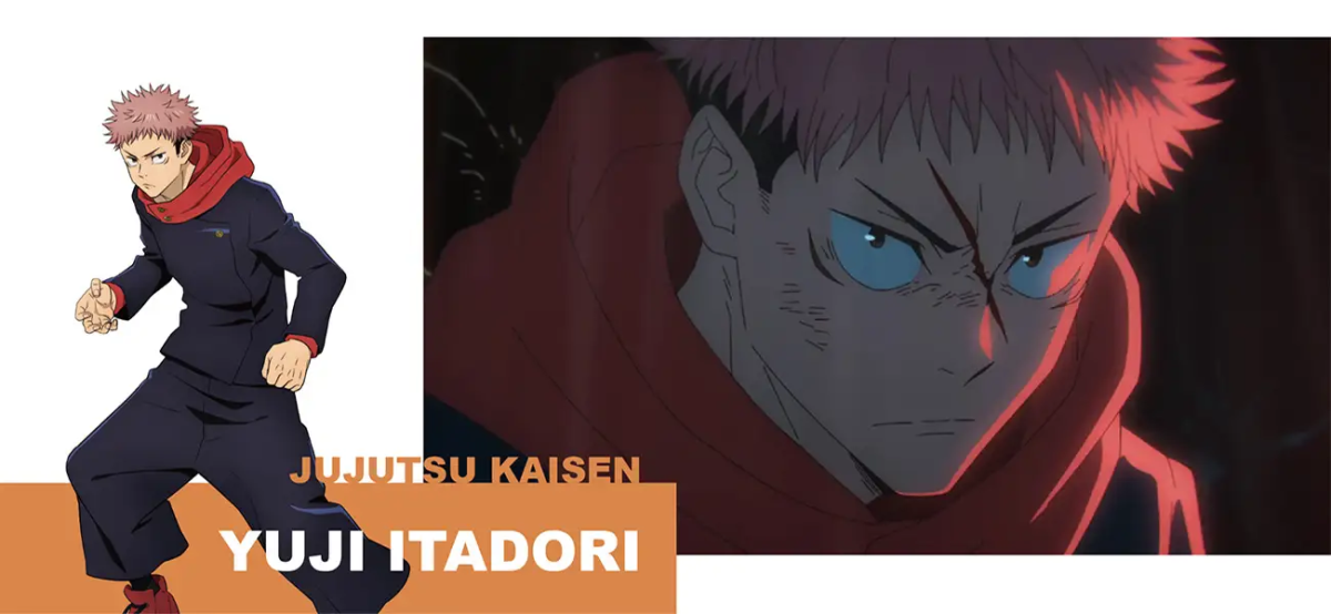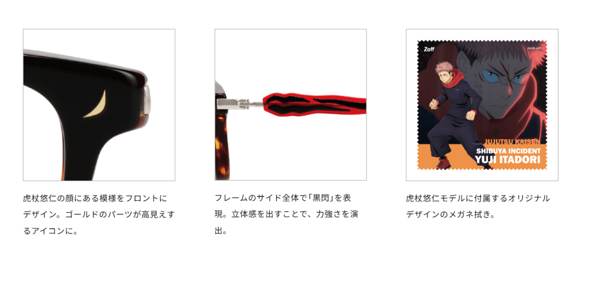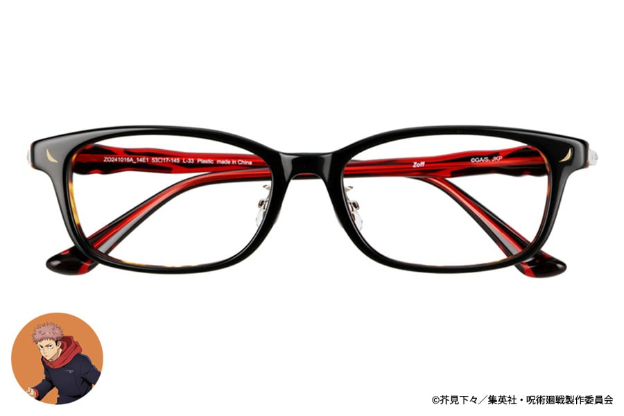 設計上以虎杖招牌的「黑閃」為靈感設計鏡框,黑紅色的樣貌有如黑閃擊中所爆發出來的光芒,鏡框兩側有虎杖因宿儺附身臉部的痕跡。