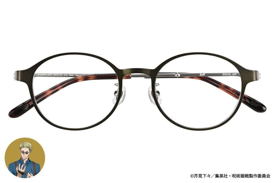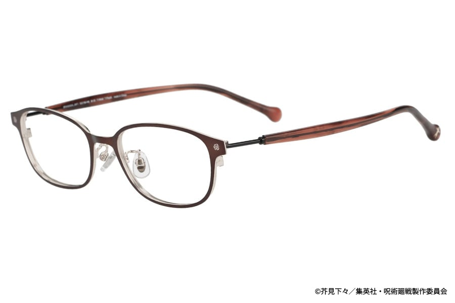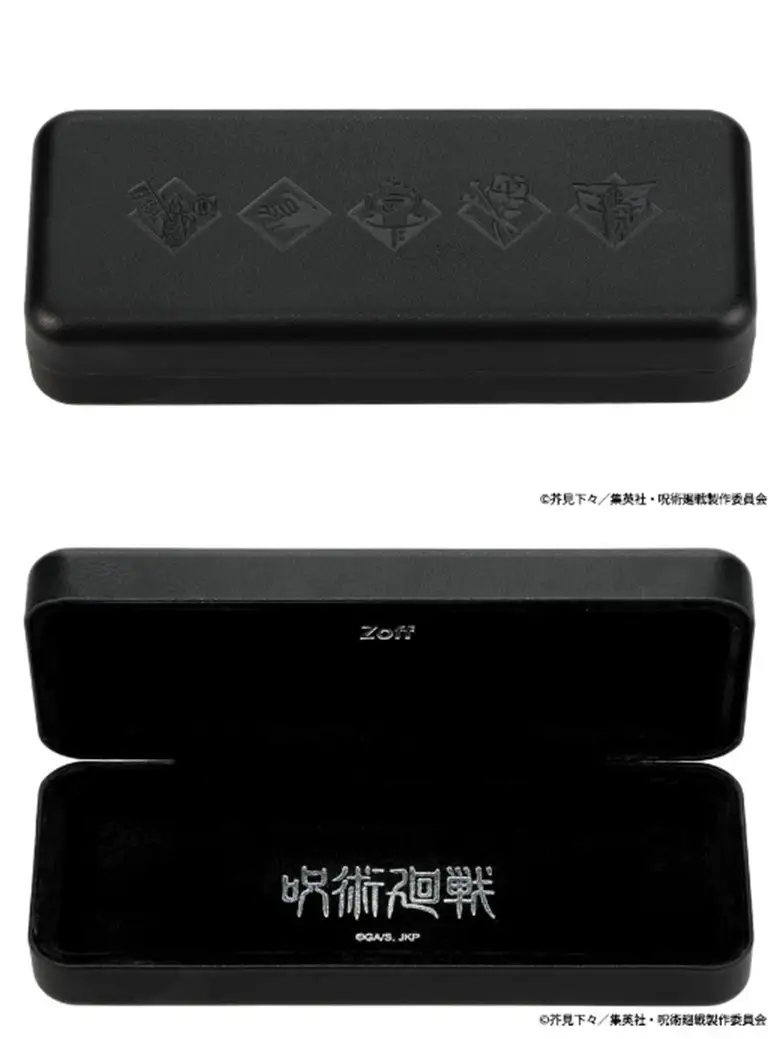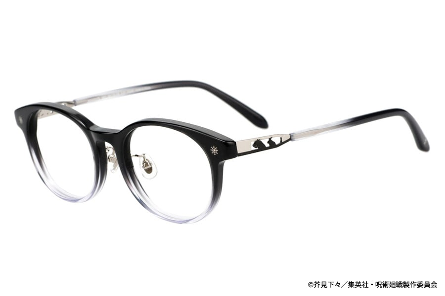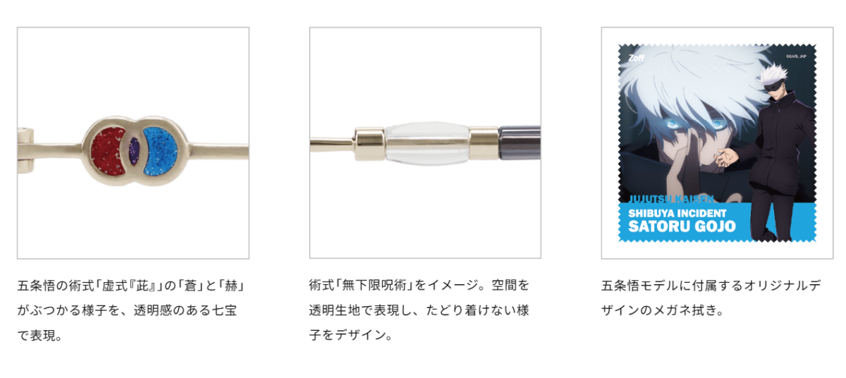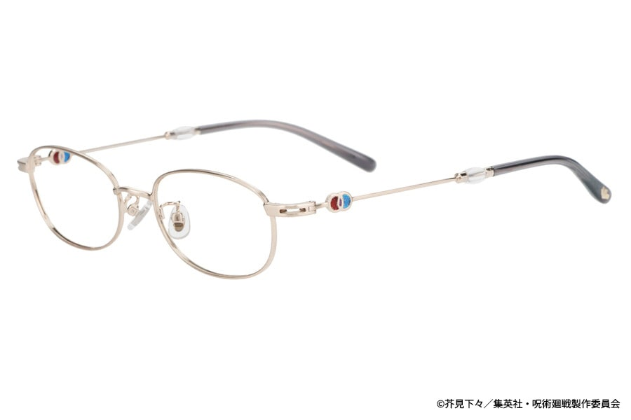 以金色金屬框為眼鏡本體來打造,鉸鏈處則配有五條「虚式『茈』」中「蒼」跟「赫」的設計,鏡腿末端銜接處則有著代表著「無下限術式」的透明空間設計巧思。