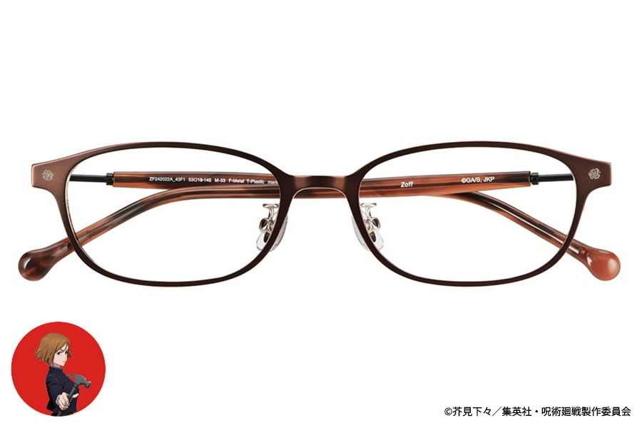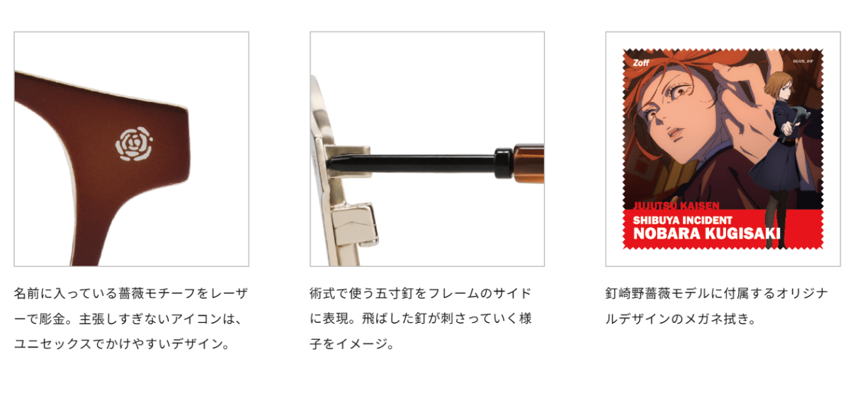 設計上以釘崎的髮色褐色為靈感設計鏡框,褐色的眼鏡本體搭配較為橢圓的鏡框更貼近中性設計,鏡框兩側有「薔薇」的圖案,鉸鏈處則配有釘崎的鐵釘造型設計。