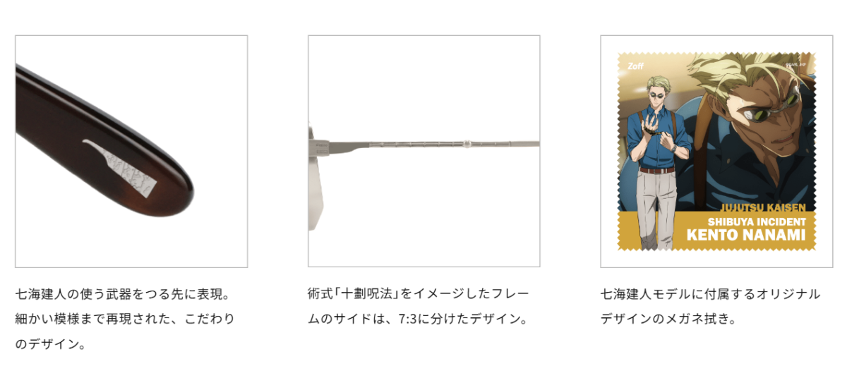 設計上以七海的眼鏡為靈感設計鏡框,黑色搭配琥珀色的漸層鏡腿有著像是七海的沉穩感,鏡腿兩側末端有七海的武器的圖案,鉸鏈處則配有七海「十劃咒法」的 7 : 3 設計。