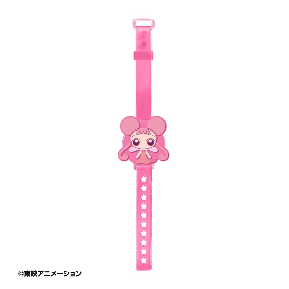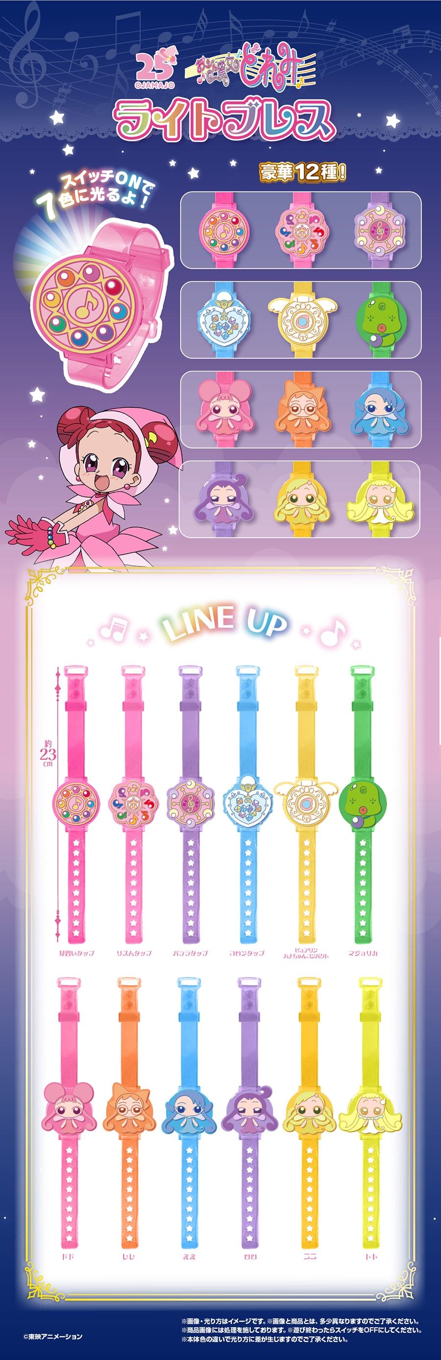 本次的「《小魔女 DoReMi》發光手環」將劇中的各個角色、道具的圖樣製作成了展開約 23 公分長的發光手環,在打開開關後就能發出七彩的光芒!道具部分收錄了見習生轉換器、旋律轉換器、帕拉拉轉換器、香水轉換器以及小花的魔法化妝盒,角色部分則是收錄魔女莉卡、DoReMi 的精靈「多多」、羽月的精靈「蕾蕾」、小愛的精靈「咪咪」、小音符的精靈「樂樂」、小桃子的精靈「妮妮」以及小花的精靈「豆豆」,加起來共提供 12 種款式讓各位收藏,喜歡《小魔女 DoReMi》的玩具人們不要錯過!