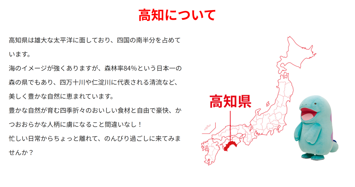 高知縣高知縣面向壯闊的太平洋,位於四國的南半部。更是擁有全國森林覆蓋率第一的「森林之縣」,並以「四萬十川」和仁淀川等清澈溪流聞名讓人彷彿能想像沼王悠閒生活在這裡。