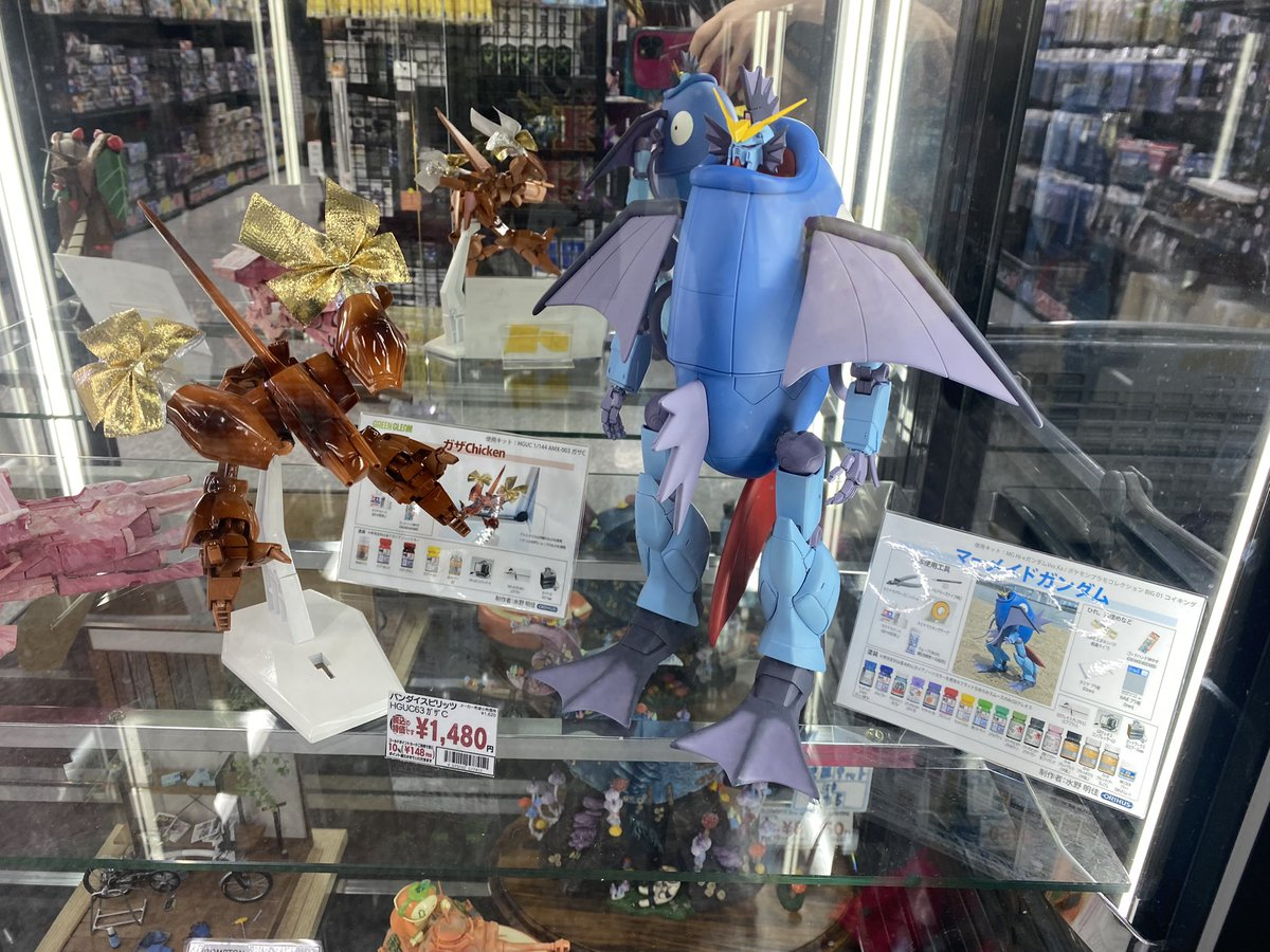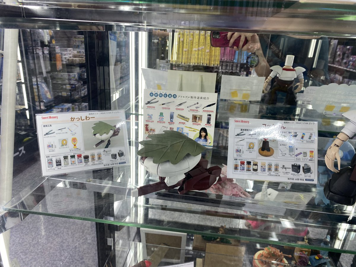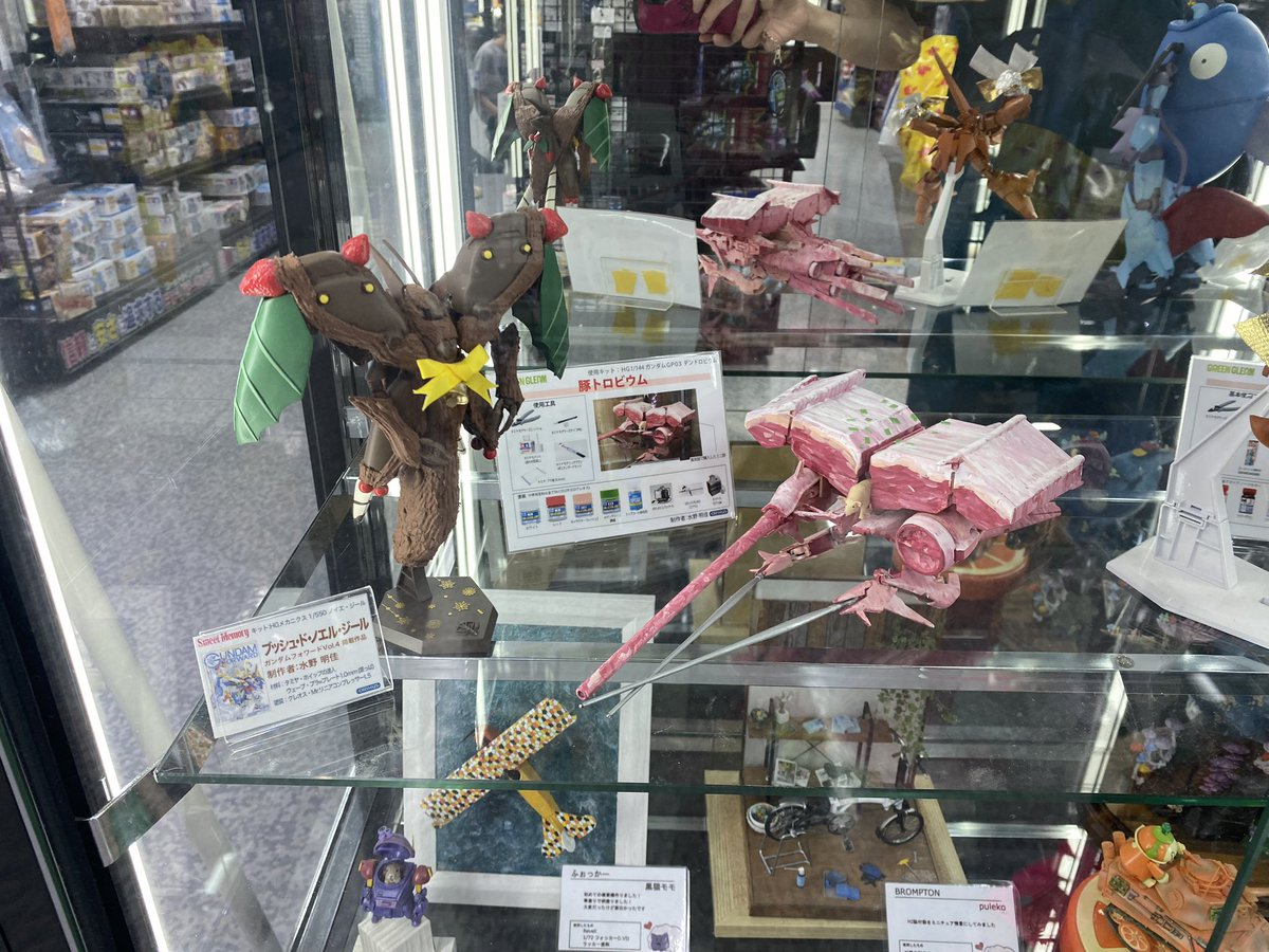 那這位創作者到底是誰呢 ? 其實就是我們先前介紹過製作趣味的「乳鋼彈」,女性模型創作者水野明佳 ( @sayaminichip ) 的作品,近期展示在大阪梅田的友都八喜,當然架上還有其他作品。