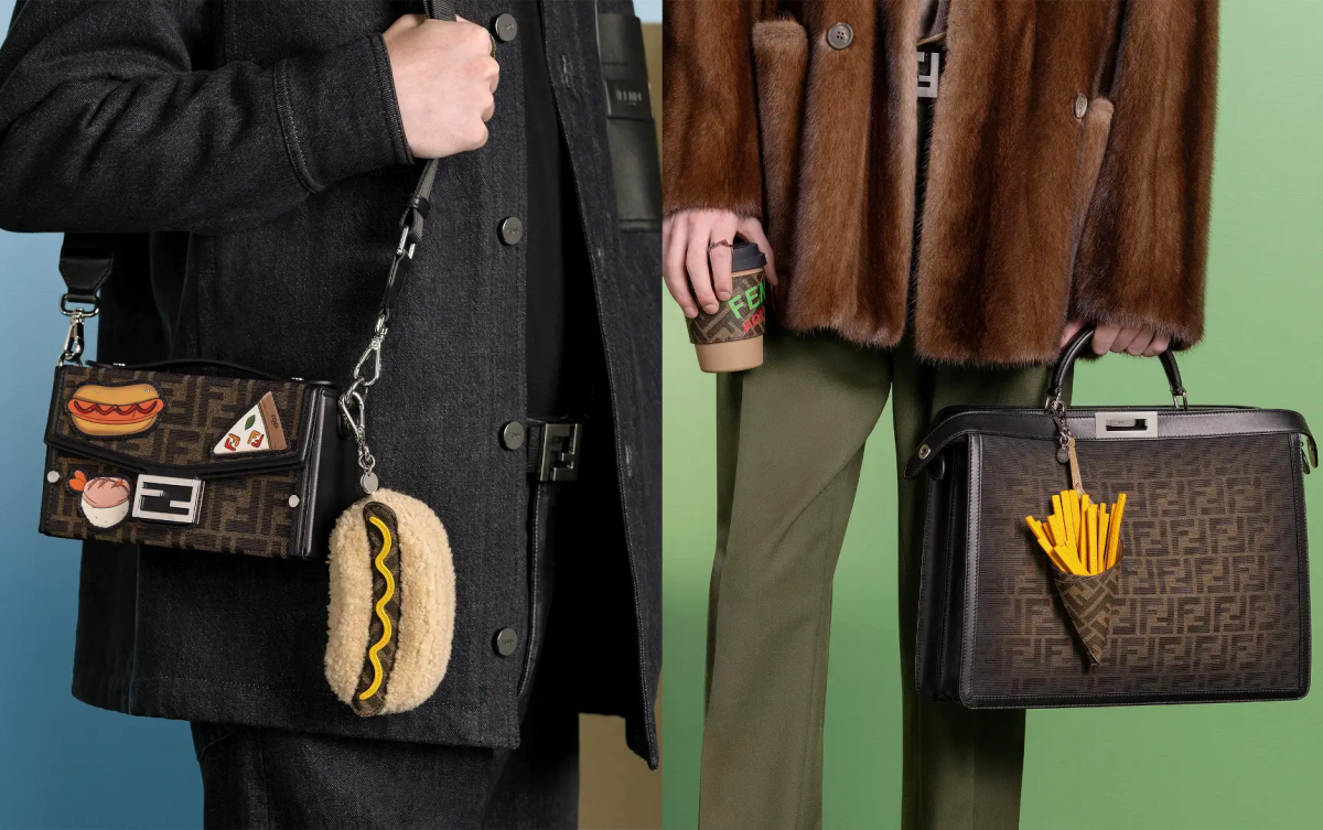 透過大家熟悉的美食元素,充滿節慶氛圍和趣味性。這一系列將熱狗、披薩、薯條等速食美食融入設計,多運用了皮革貼花、鑲嵌和印花等細緻工藝,展現出 FENDI 獨有的趣味與高超的手工技藝。例如 : 實物大小的熱狗和薯條,飯糰等造型吊飾,可隨心所欲地掛在包包、皮帶環等位置,為造型增添亮點。