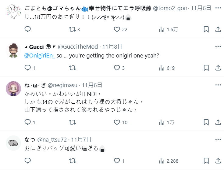 近期在日本 X 上,義大利精品品牌 FENDI 所發表的新系列「フェンディリシャス」(Fendilicious)意外引起網民熱議,尤其是這款「飯糰小包」讓人匪夷所思,居然這是出自精品的商品。