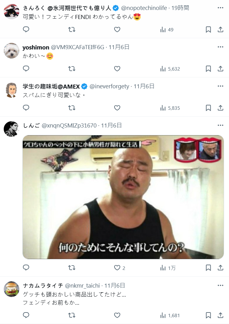 這樣的價格的確讓人有點驚訝,但畢竟精品品牌的商品本來都不親民,會有這樣的價錢不太奇怪。不過亦有網友認為,這些設計的確是滿有趣味的,對這個奢華品牌的玩心大開感到驚喜,網路上紛紛熱議:「FENDI飯糰要18萬?!」、「飯糰周邊的最高境界」、「也太可愛了吧」、「FENDI的蝦子超讚」與「蝦子可愛到不行」等反應接連不斷。