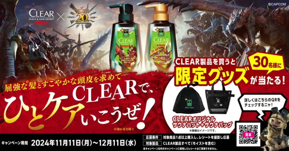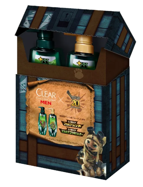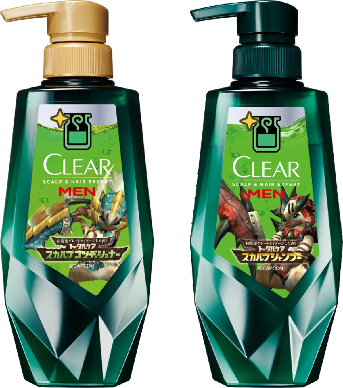 聯合利華日本公司與髮品品牌「CLEAR 淨」攜手今年滿 20 週年的遊戲《魔物獵人》推出合作系列,限量瓶裝套組,展現出有如原作遊戲中的補給品外形。同時還舉辦「用CLEAR,來場護髮狩獵吧!」( CLEARで、ひとケアいこうぜ! ) 抽獎活動,有機會贏得豪華合作限定商品。