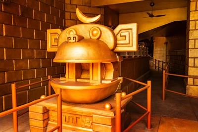 穿過區域後方矗立的「黃金神殿」,你會進入最新的遊樂設施「咚奇剛的瘋狂礦車」。入口處有一座巨大的「猴子神」雕像,還有非常讓人熟悉的壁畫圖案。